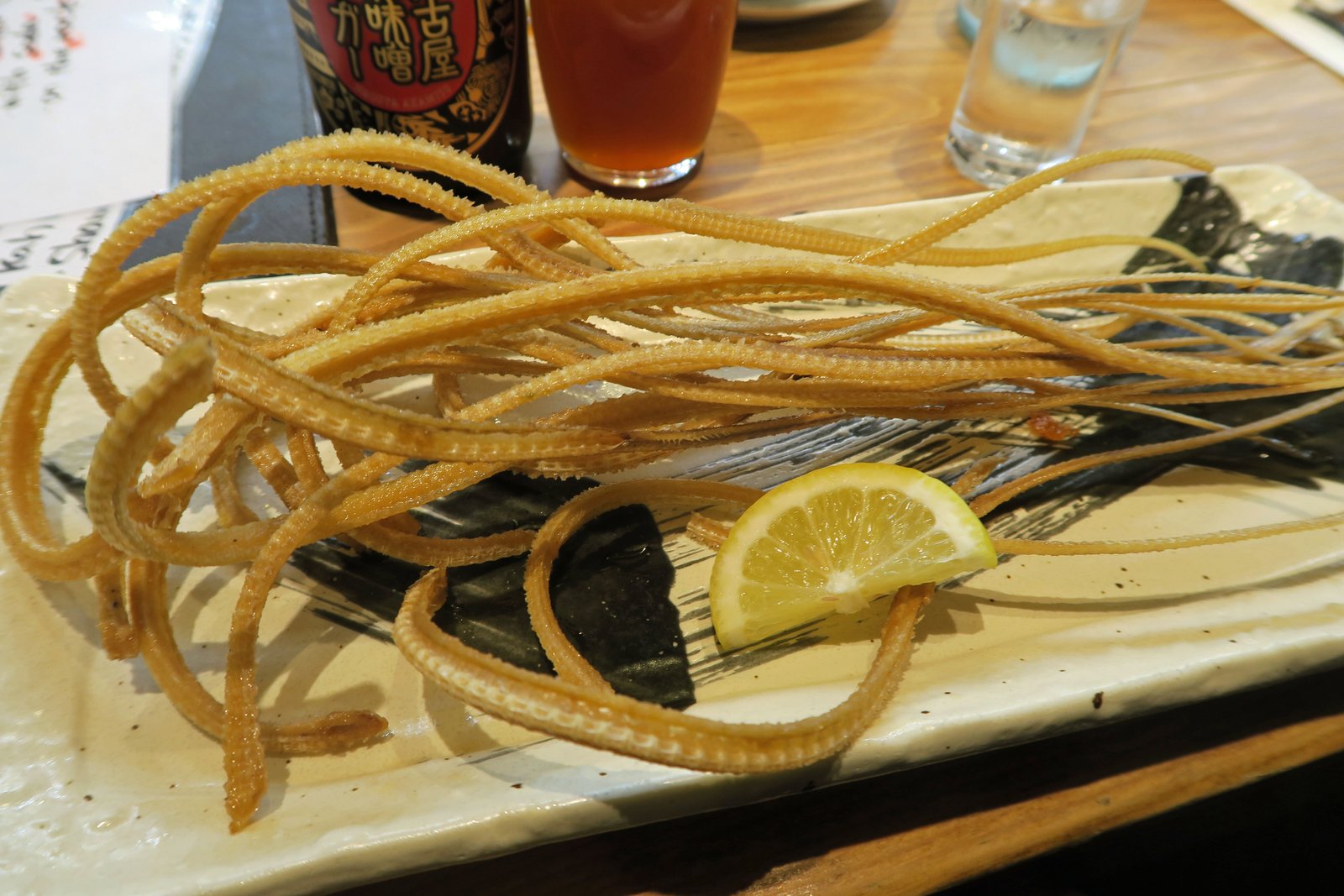 Looking at the menu cracked me up….along with a bunch of "obanzai" style dishes, there seemed to be every Nagoya specialty on the menu….from Nagoya Teba, to Miso Katsu, to Hitsumabushi, to Kishimen! And some of the menu translations were quite humorous as well…….