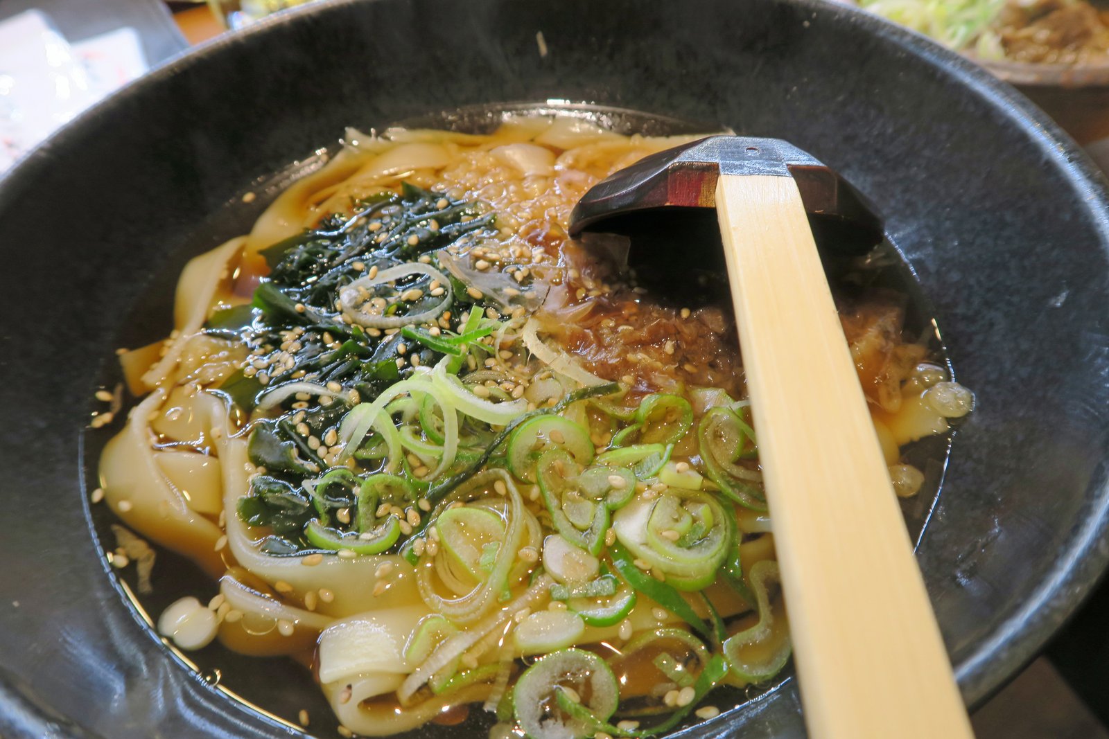 The broth had a nice, almost a condensed, dashi flavor, deep umami. The flat, udon like noodles, had a good stretch to them and the texture stood up for the entire bowl. The Missus enjoyed this so much, she asked me to find one other shop for this before we left…….that was going to be a bit of a challenge, but I did find a shop (stay tuned) in an interesting location.