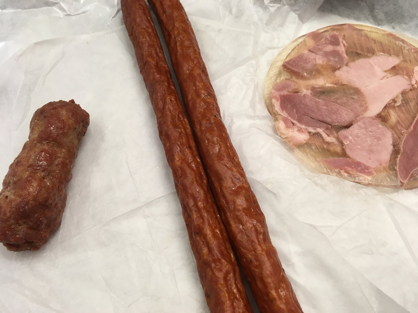 The cooked piece of mititei, two cabanos sausages (dry texture, yet not tough; black pepper is in this smoked pork sausage) and three slices of head cheese(mild, not spicy)(excellent, with tongue and many other meat parts).