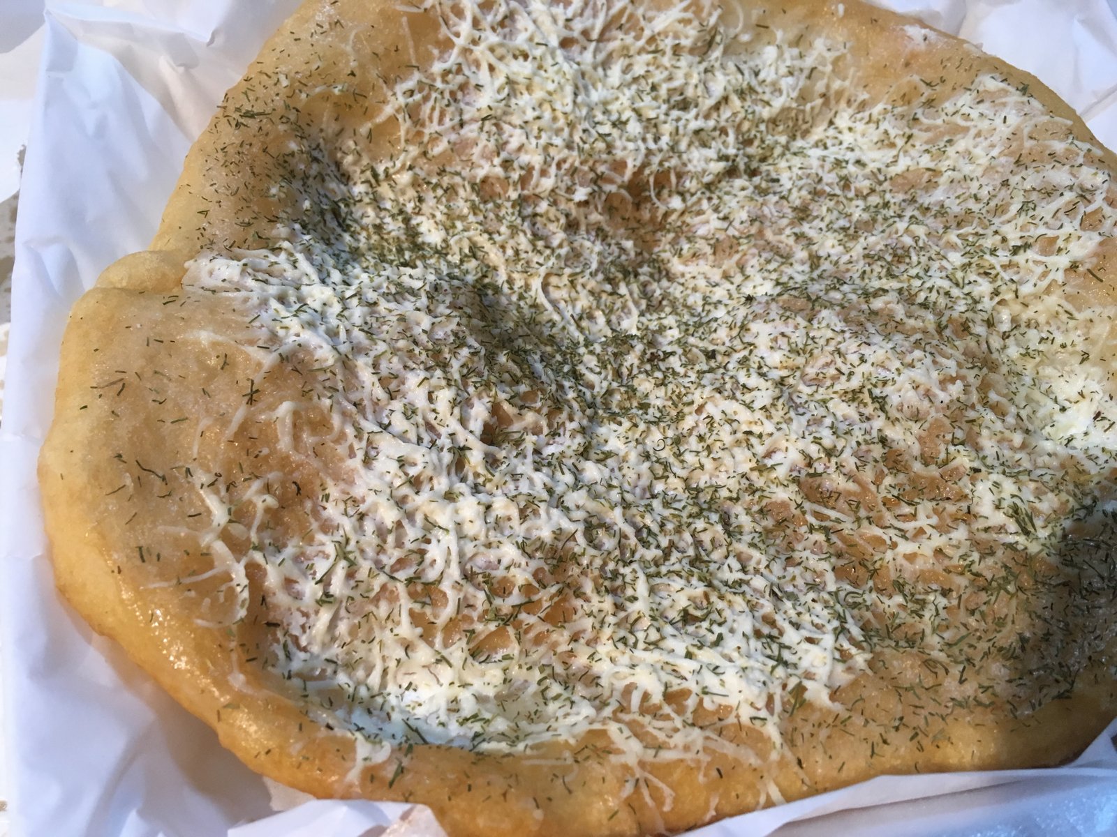 Langos, a Hungarian flatbread, is offered in both sweet and savory versions. This is the savory version ($6.25), topped with 'everything'- sour cream, garlic, Feta cheese and dill. A fresh made, tasty snack. It can be ordered topped with any deli meat for an additional $1.99- that will make it a meal.