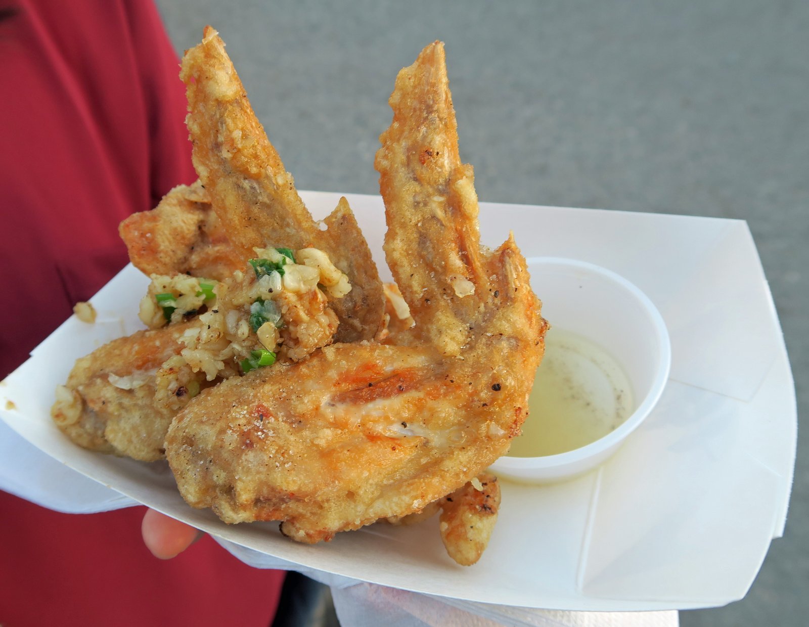 Notice that container with the spoon; the wings are fried, then mixed in a wok with garlic, scallions, and a spoon full of that mysterious white substance….which I'm fairly certain isn't only salt.