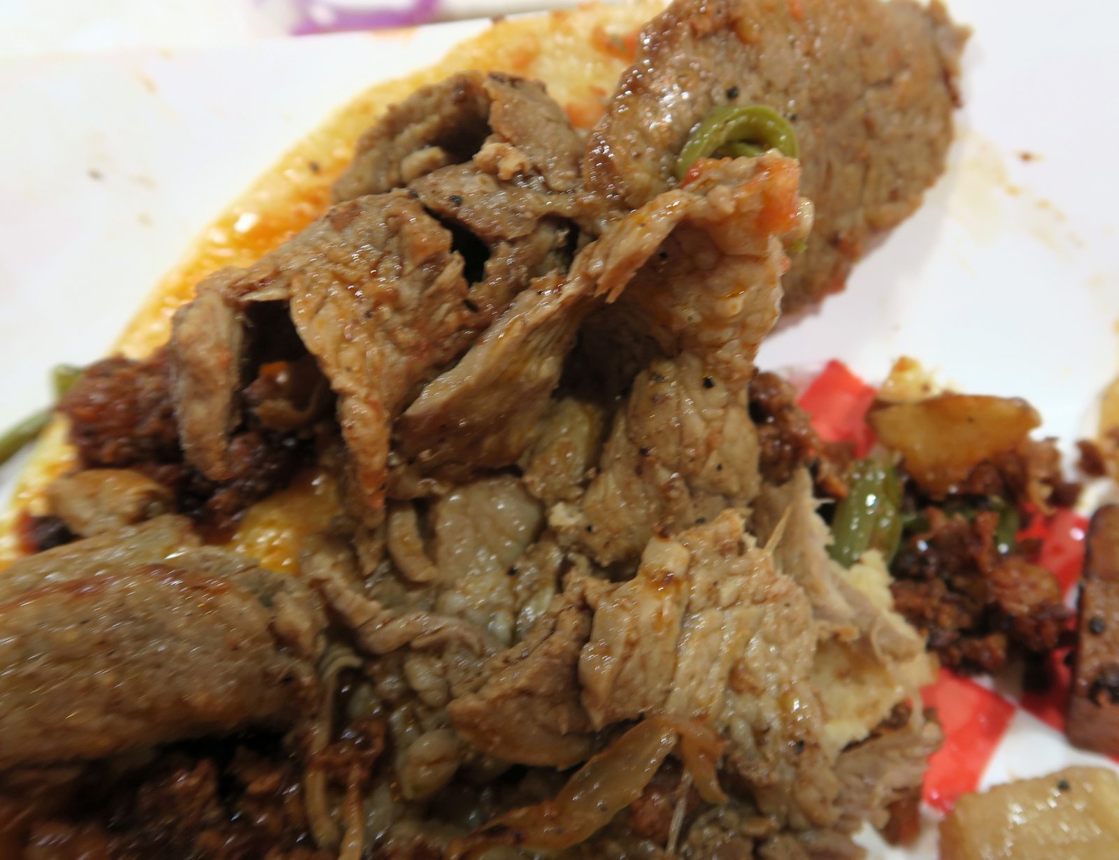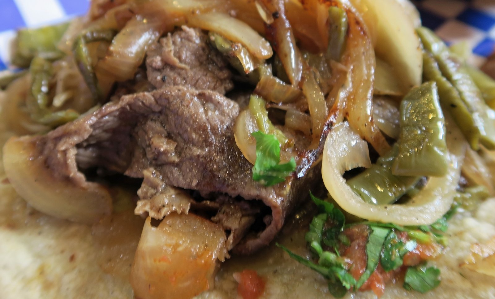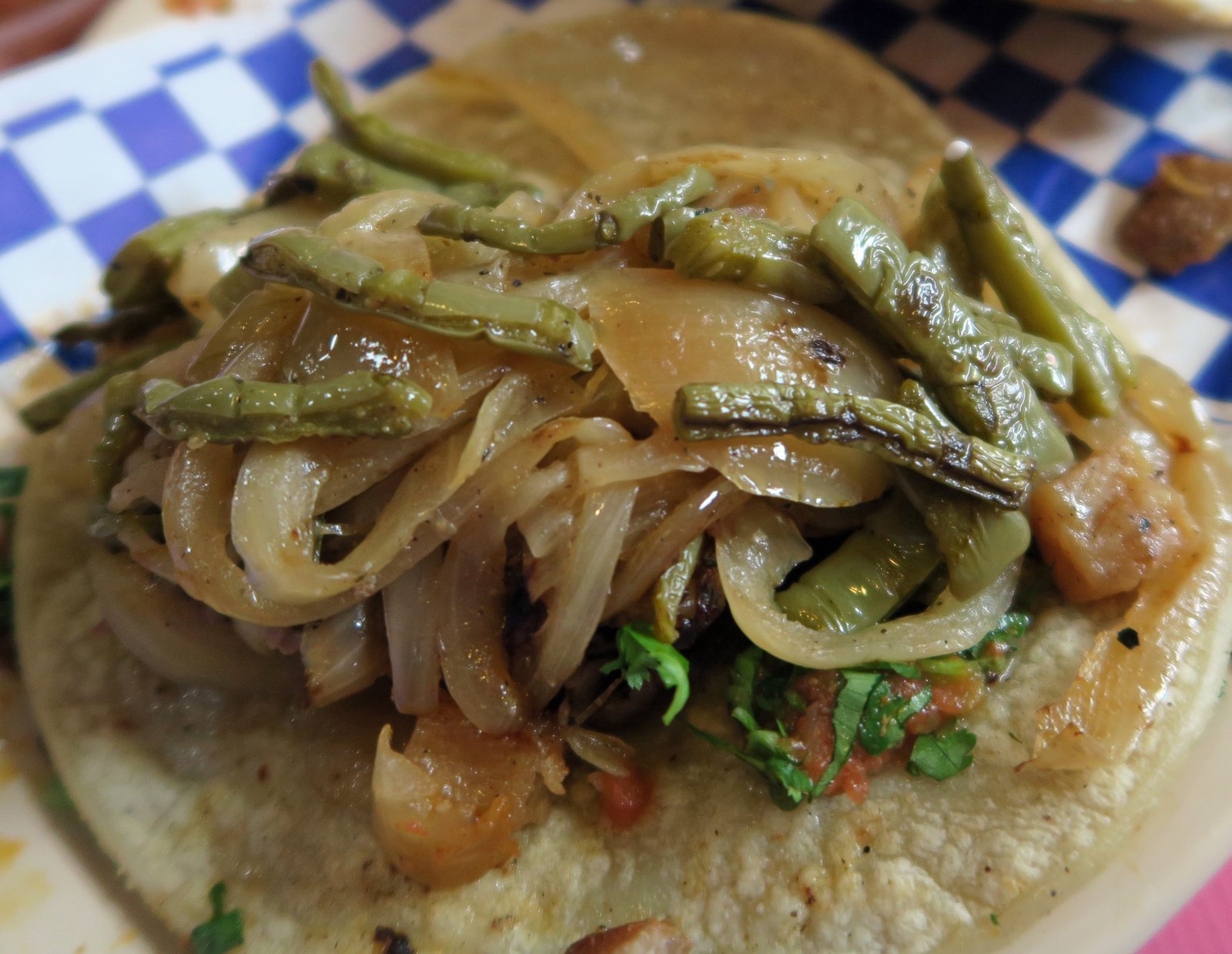 When I think of Tacos Perron, the meat is grilled flank steak, mild, but with a nice beefy flavor. This was the usual thin slice beef, you know, the stuff used on your run-of-the-mill carne asada. It was the tough side and lacked flavor. Also, this version used the corn tortilla, which, as you can see in the photo to the right was not up to the task, versus the flour tortilla with a nice layer of cheese melted on the bottom to help preserve it. No beans on this one. It had some nicely seasoned nopales, which, while on the salty side really brought that green bean like flavor along with a pleasant sliminess and griddled onions which were also quite good.