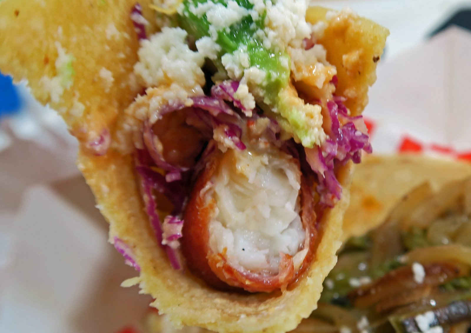 On my first bite I was greeted with a nice bacon wrapped shrimp. The bacon was so crisp that it was like having a bacon flavored batter. The creaminess of the avocado and the slightly milky cheese worked together nicely. And the absence of grease or liquid, the tortilla held up, though it's still not my favorite tortilla.