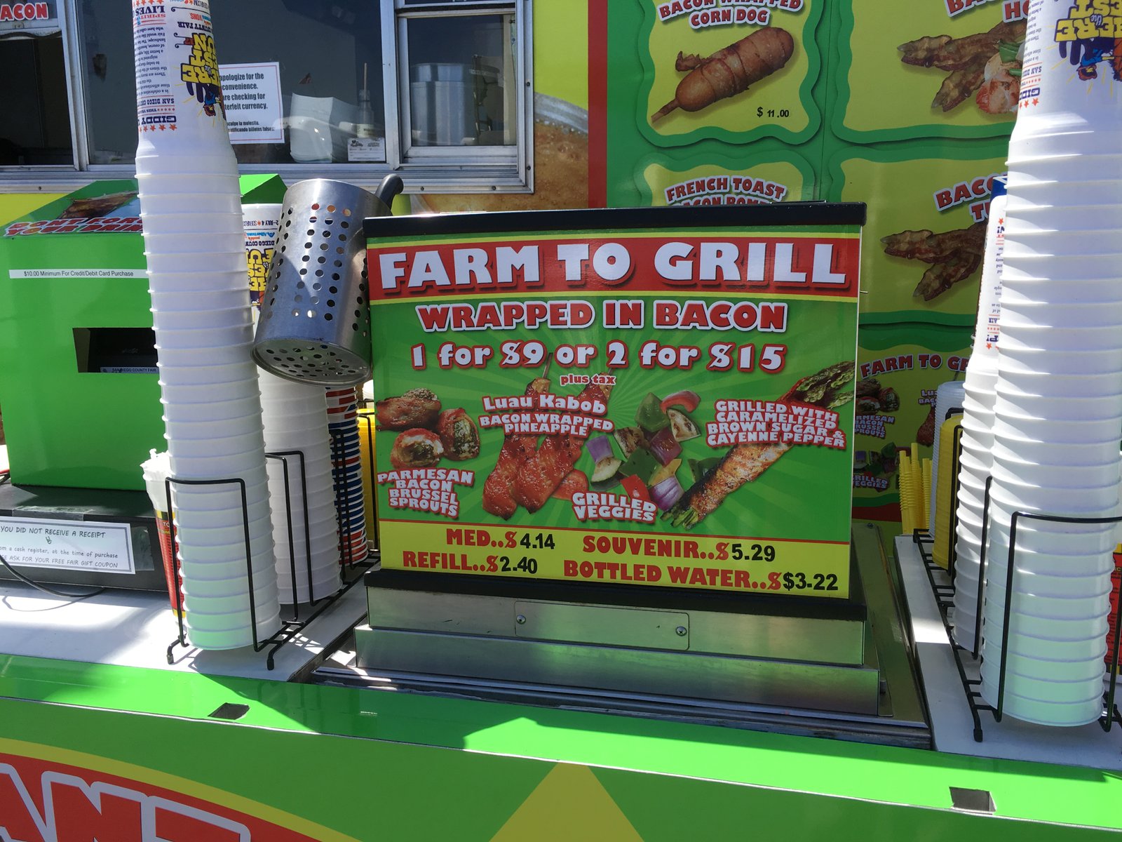 Even though Bacon-a-Fair didn’t have the new bacon wrapped cactus posted on the menu board when I visited, I was able to order it by asking. They prepared it as a special order thus it took awhile to get. Small but slime-y and tasty.