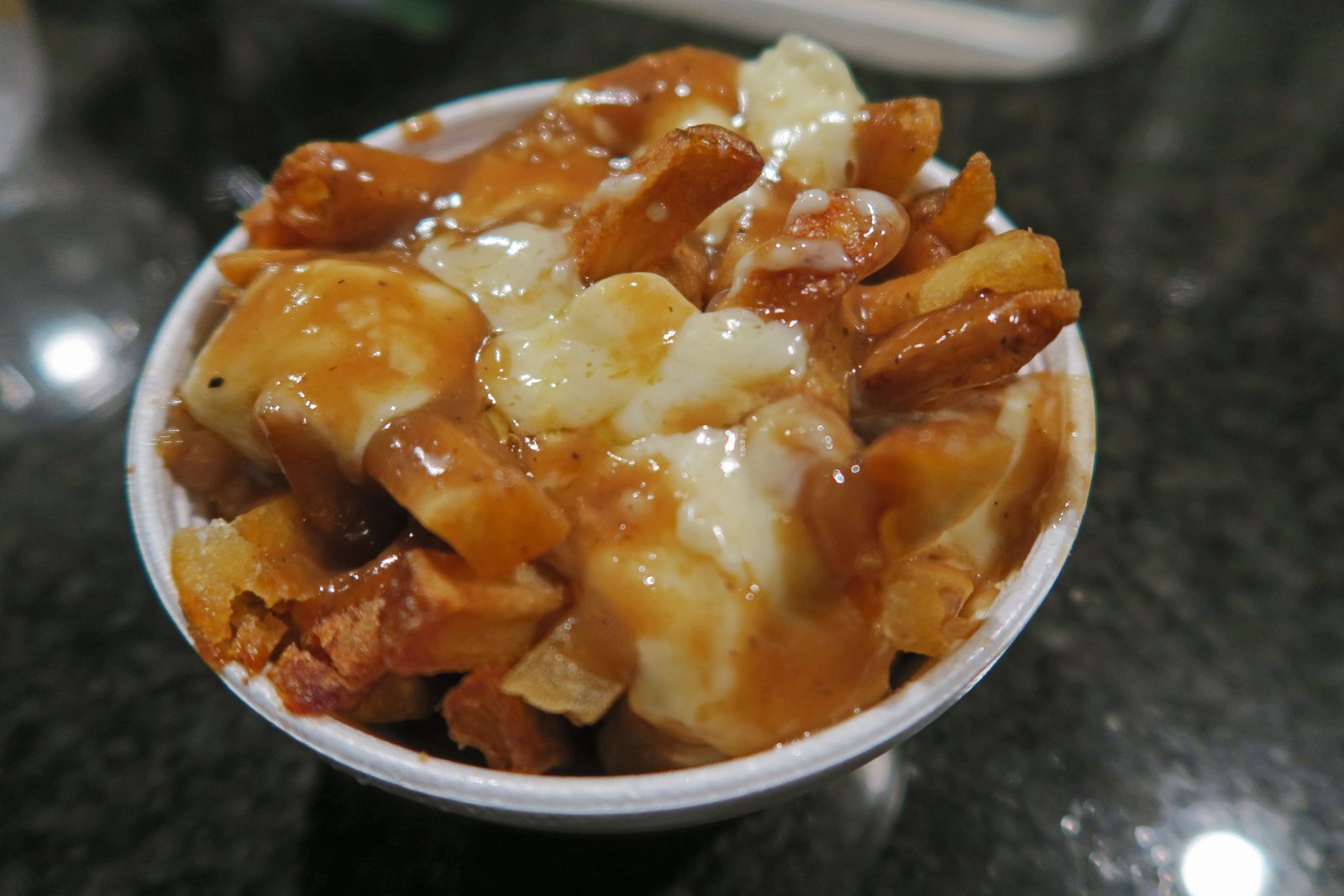 The cheese curds were nicely melted, yet some of them still had a good texture by the time I got back to the apartment. The gravy was too salty and the fries were overcooked, hard (not crunchy), and rather dry.