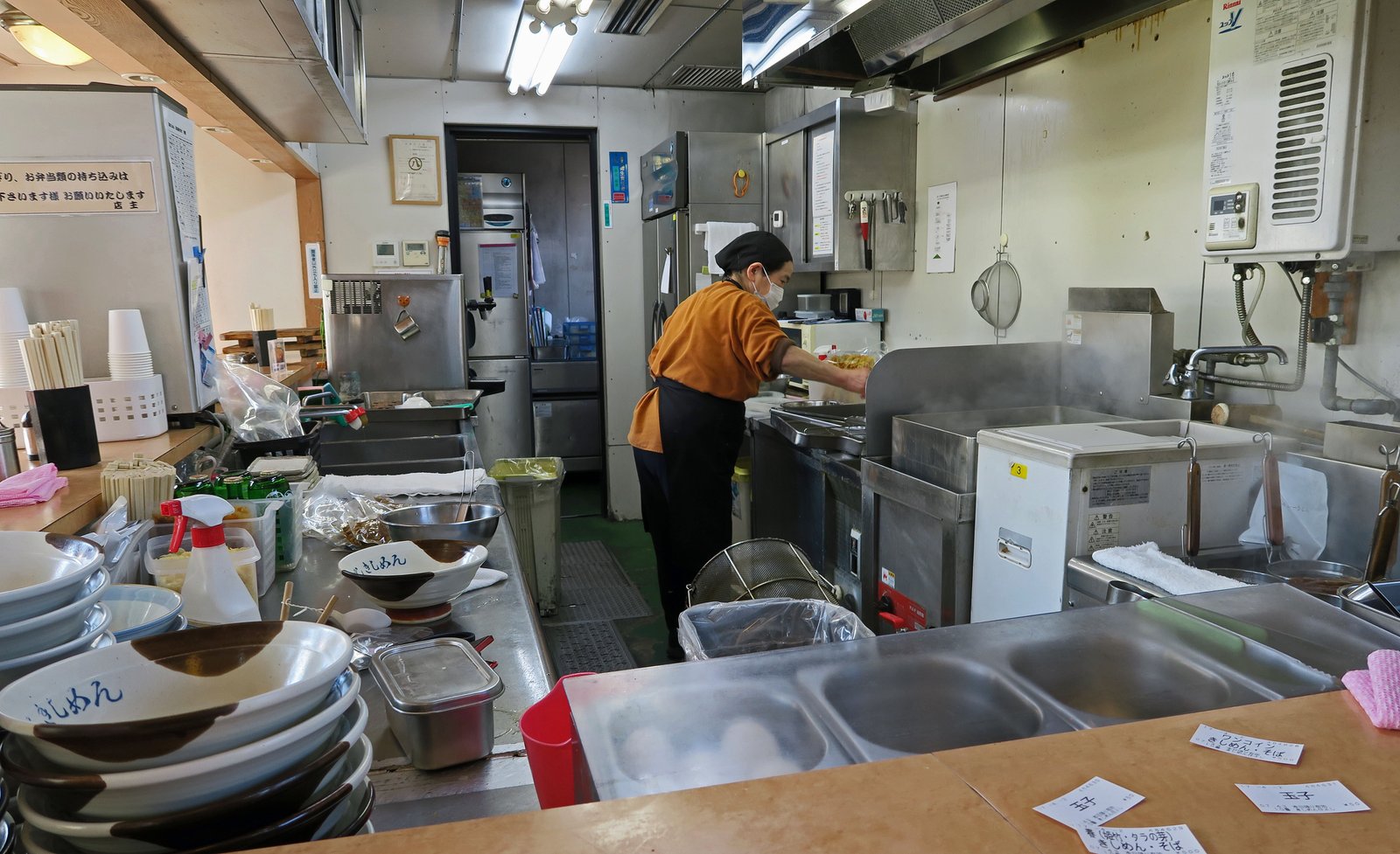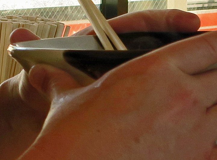 Of course ordering was by ticket machine and the Missus being to read Kanji helped a bit. We put our money into the machine and got our tickets. The shop opens at 0730; it was almost 8 and the only other customer in there was finishing up already. We surrendered our tickets and the woman went to work. It was a tidy little shop; a one woman show here….she was super organized and even communicated via sign language to let us know that there already was an egg in what the Missus ordered and did we really want another? The answer of course was yes.