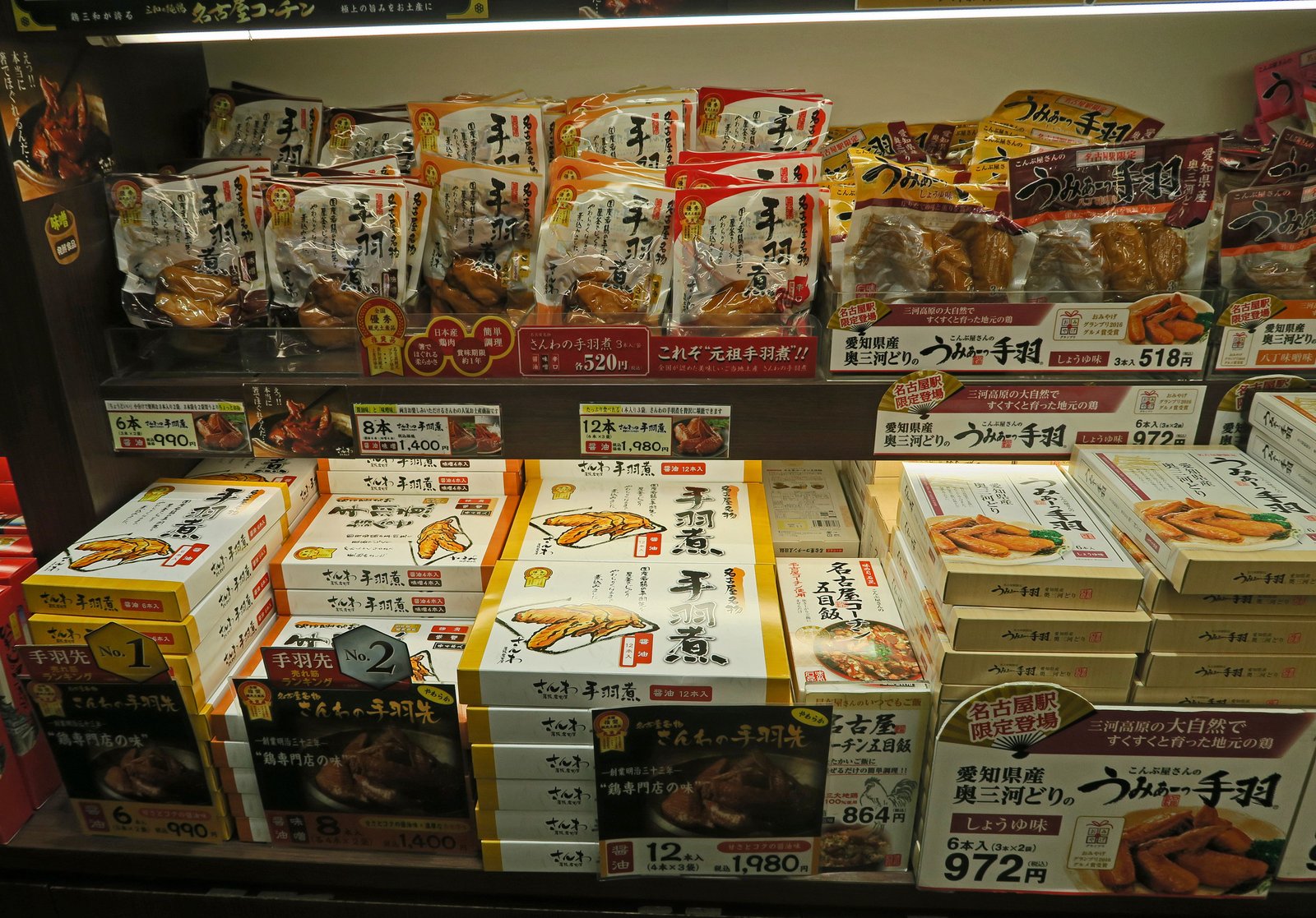 We got our things together, cleaned up the apartment, showered, closed up, and basically crossed the street to the JR Nagoya Station where we checked out some of the shops featuring local snacks….the ever present Nagoya Teba, in gift boxes for your enjoyment!