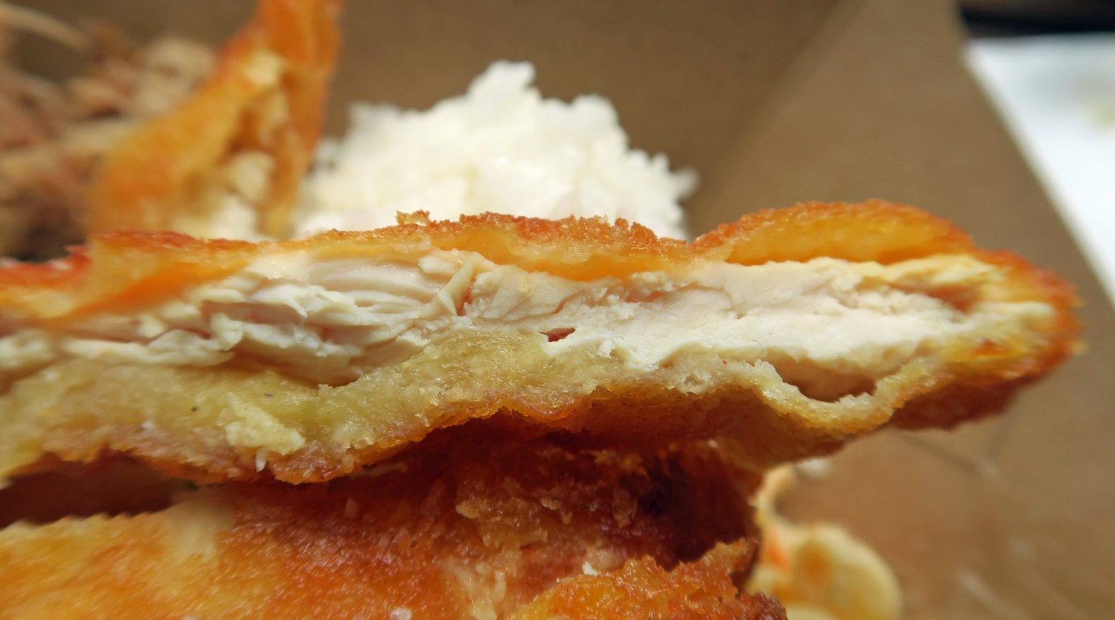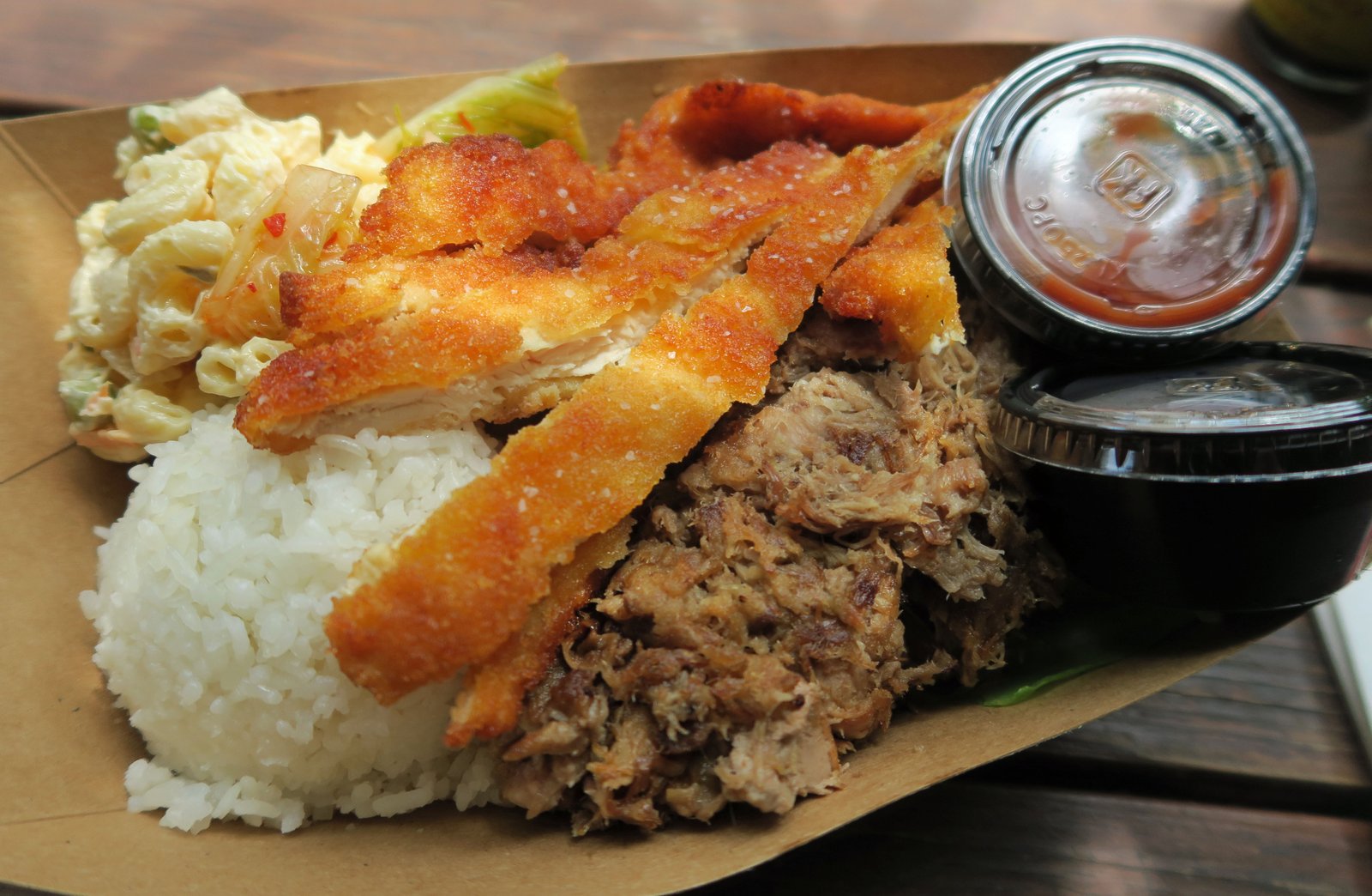 First off the rice was a tragedy; mostly hard bits. The Kalua Pork was pretty darn good if on the dry side….it looks like they dump it on the griddle to heat up. Nice salt, mild smoke, other than being dry, it was nice. The Chicken Katsu was not to my liking; it looked like it had been pounded flat, with more, really hard instead of crisp breading than chicken and not much in terms of flavor. The katsu sauce tasted odd; like there was something fermented in it?