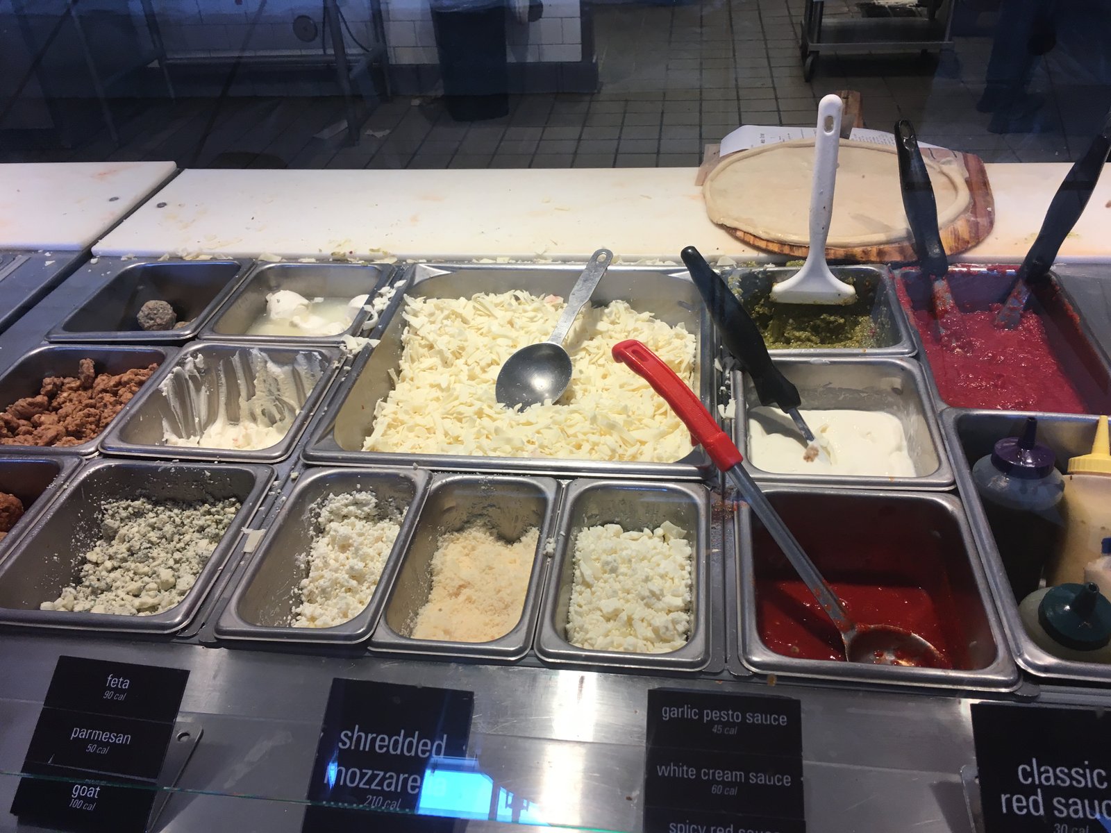 There are a variety of sauces and cheeses to use as a base and the amount of ingredients available is excellent; even if you 'Build your own' pizza, using a lot of toppings, the cost is $8.25 (there is only an extra charge if you want a thicker crust or a gluten free crust).