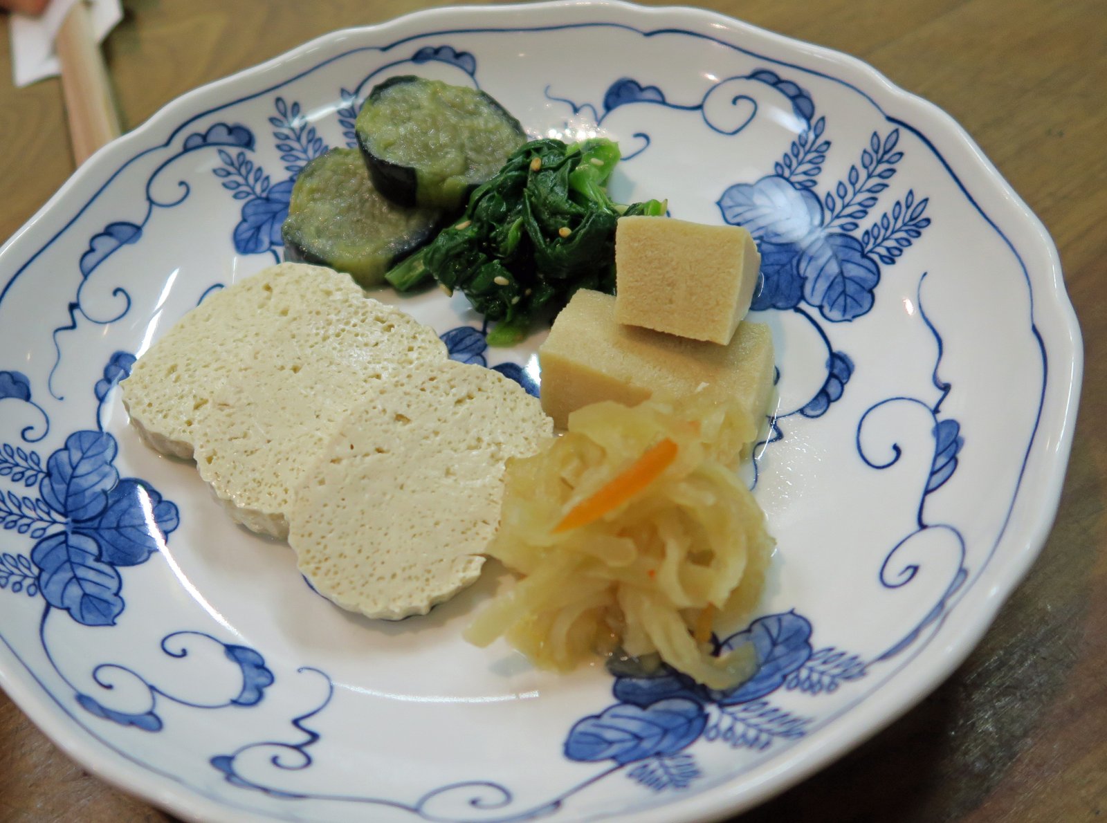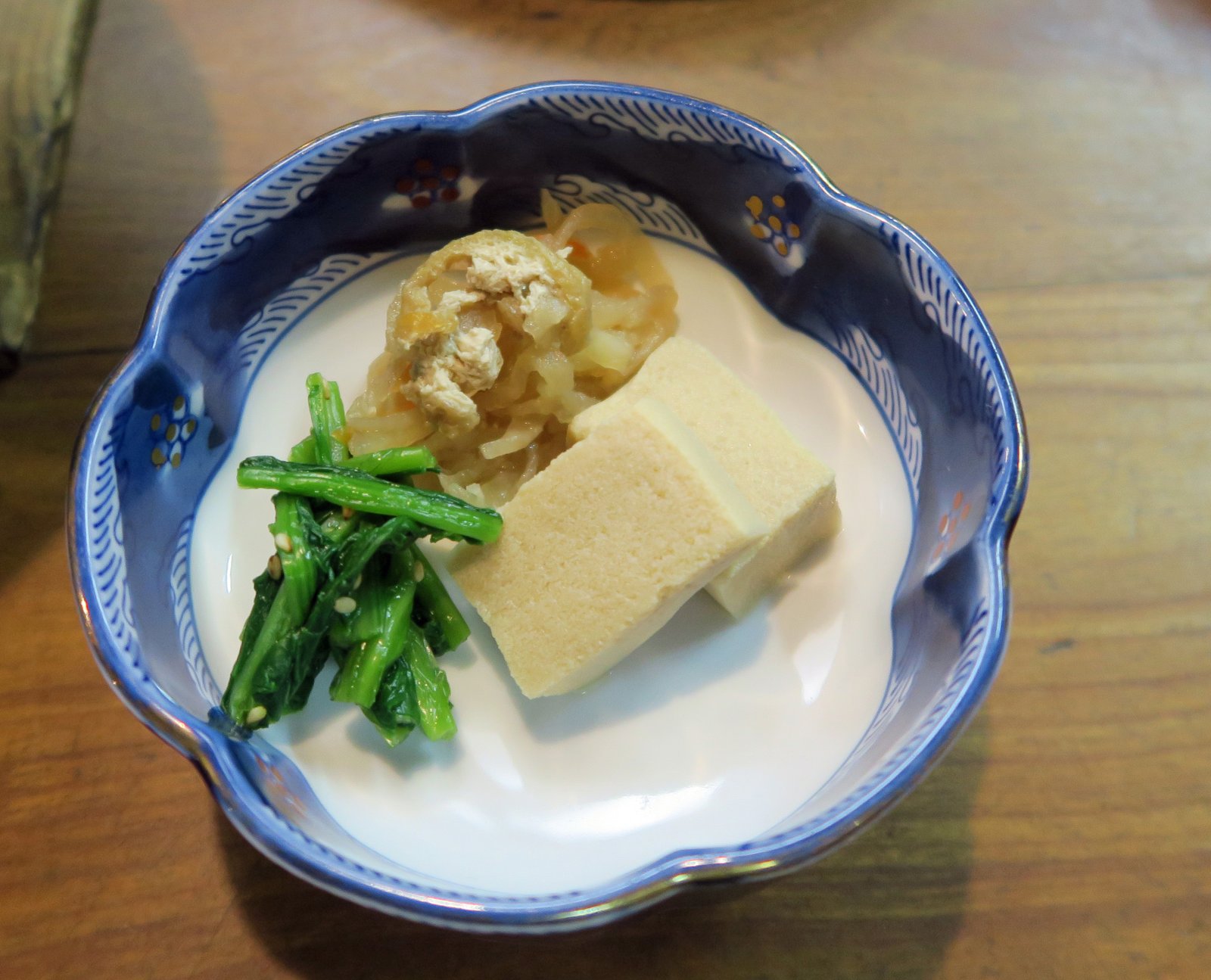 The cucumber had a nice fermented flavor; I'm thinking perhaps kasuzuke? There were two different types of tofu provided; the one that looked spongy really seemed like frozen tofu; I'd never had kouya tofu before and we both just loved it. The Missus loves Her frozen tofu….well, just tofu period and these two version had really condensed bean curd flavor.