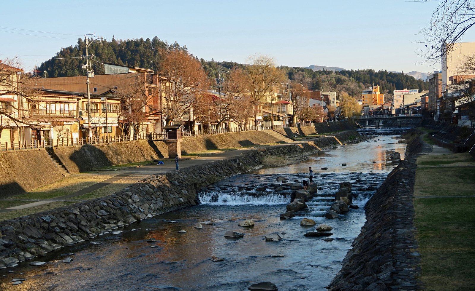 We took a short nap after visiting Hida Folk Village and having lunch at Maruaki. When we woke, it was close to dusk. We decided to take a walk around Takayama before settling in for dinner. As with many tourist day trip destinations; Hida-Takayama slows down at night. Things were so peaceful and relaxed. We got a kick out of watching these kids having fun around the Miyagawa River. Remember, it had snowed just two days previous, so that water must have been pretty cold.
