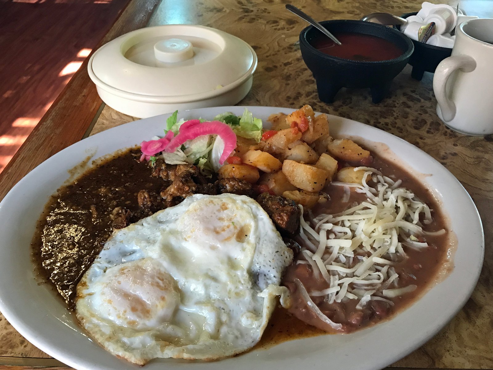Man; this was delici-yoso. The pork was moist and tender; that sauce, as Ed noted, wasn't very tangy, but had a nice balance of flavors. The smokiness from whatever pepper was used for it came through nicely. The salsa added a touch of heat, but was still mild, but really helped to cut any richness. The tortillas were excellent; I ate them all….and of course those runny eggs, adding another layer of velvety richness to the dish. The beans were good as were the breakfast potatoes. But it was all about that pork.