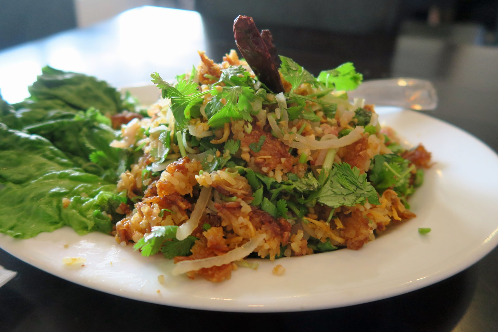 The Nem Khao was decent; better than the version at Mekong Cuisine in my opinion. Though it was a bit more chewy than I enjoy; I could actually make out the hints of coconut in this, there was also a good amount of sour sausage as well. Strangely, the dish was served on the cold side and there were only two leaves of lettuce provided.