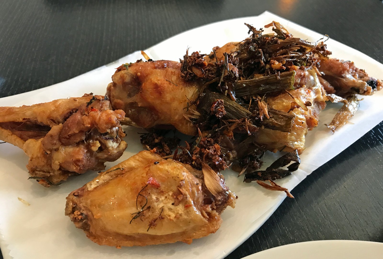 The wings were nicely fried; though there was a good amount of blackening around the bone, the meat was tender, the skin fairly crisp. Seasoned "salt and pepper" style. I really didn't care for the bitter fried lemongrass that topped the wings.