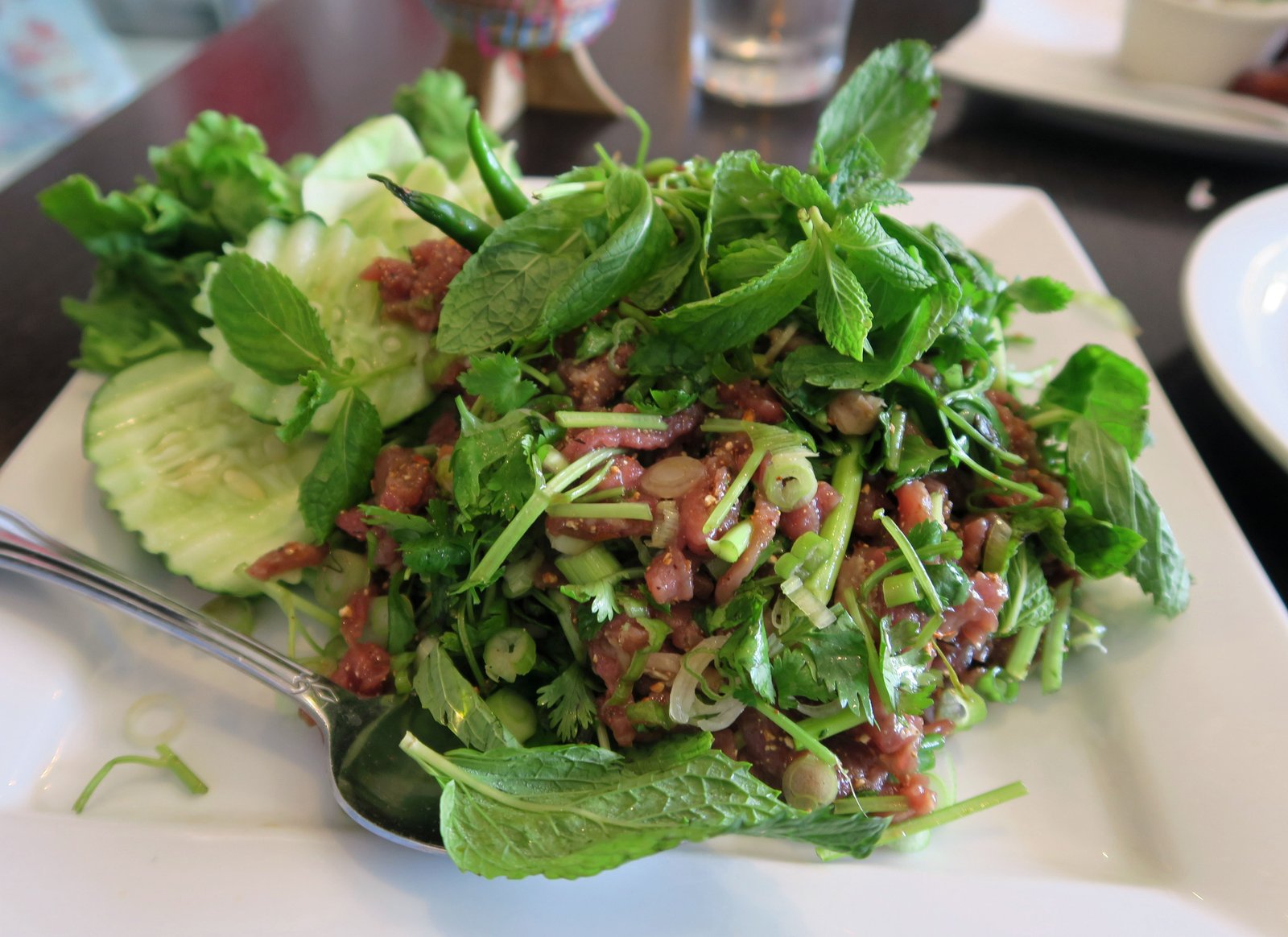 By now, I thought it was time to just go for it. I went ahead and ordered the Beef Larb ($10.95). The really friendly woman working was shocked when I said "Lao style" and nodded yes, when she asked me if I wanted it "rare".