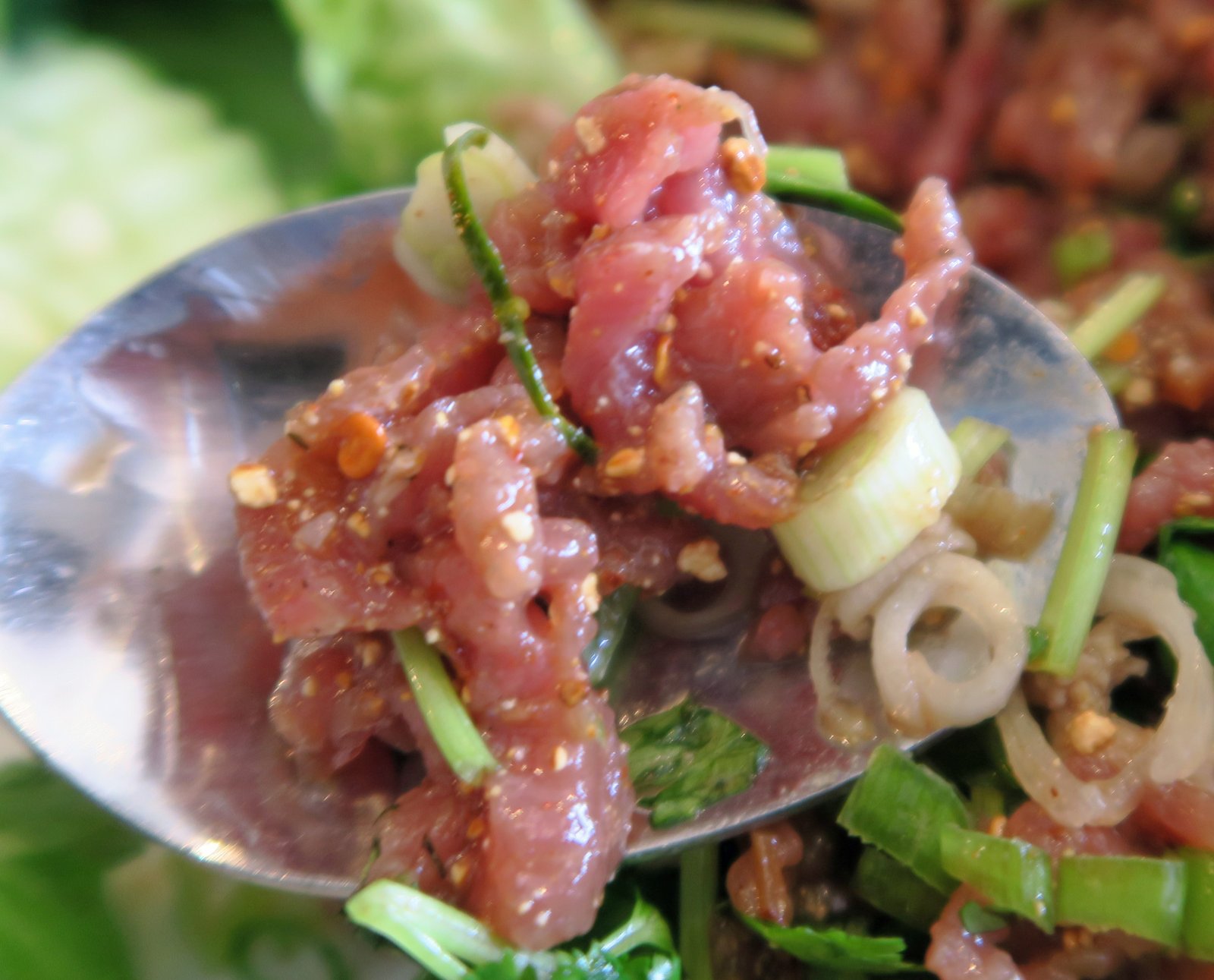As you can see; by "rare" she basically meant raw. There was a good amount of nutty rice powder on this, though I wish it was more spicy. What really made this "Lao" for me was that it had no citrus, but a good amount of puckery-bitterness, which goes really well with the mint and other herbs. I'd learned of the importance of beef (water buffalo) bile in koy and larb during my cooking class in Luang Prabang. Though no one else in the class would even try the stuff, I found the flavor quite interesting. Here, I could have used a touch of citrus as well; I'll have that done the next time I have the dish. As for the bitterness? Well, I had a nice discussion with the woman working and was told they pick up fresh beef bile from a specific farmer once or twice a week.
