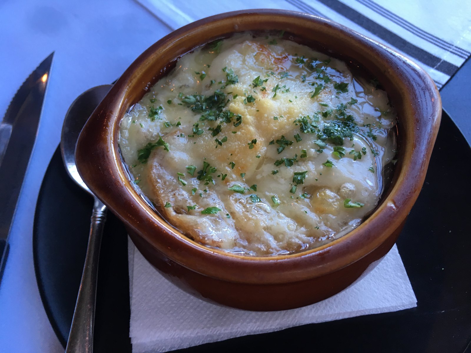 The French onion soup ($8) has a lamb based broth; probably because lamb chops are on the menu (at the bottom of this post) as both a "Starter" and a "main". It is wonderfully unique in flavor and combined with the melted cheese, bread and mild onions; a filling appetizer.