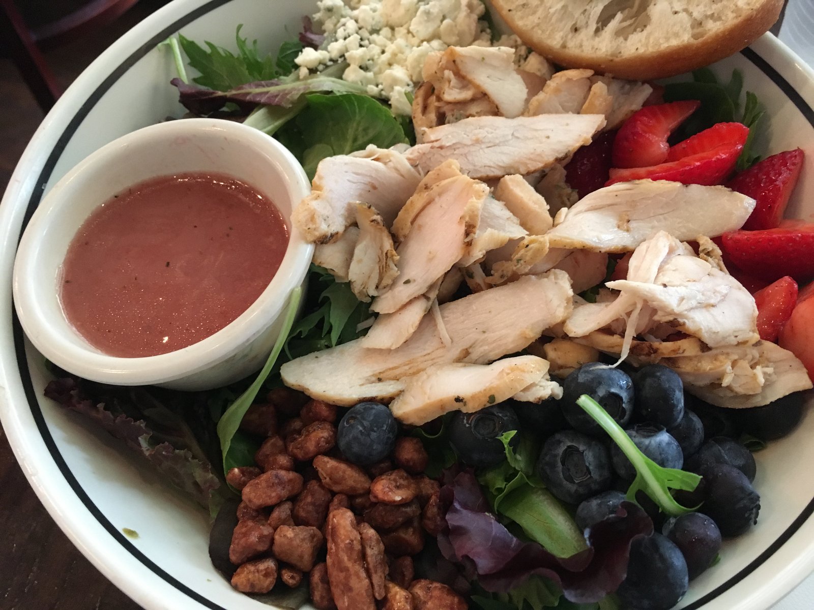 When we stopped in for lunch one day, there was a special seasonal salad advertised on the front door poster (I forget the name; it was $8.49). Strawberries, blueberries, glazed nuts and blue cheese as well as a good portion of grilled chicken. This was served with a (sweet) strawberry vinaigrette which wasn't necessary. The blending of flavors and textures was just right. I do enjoy trying limited time offerings.
