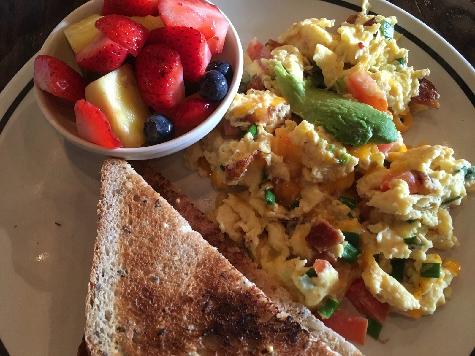 Anaheim Scramble($7.99) with a side of fruit and Harvest toast (nutty and seedy) is simply eggs scrambled with tomatoes, green onion, cheddar and avocado. Really good.