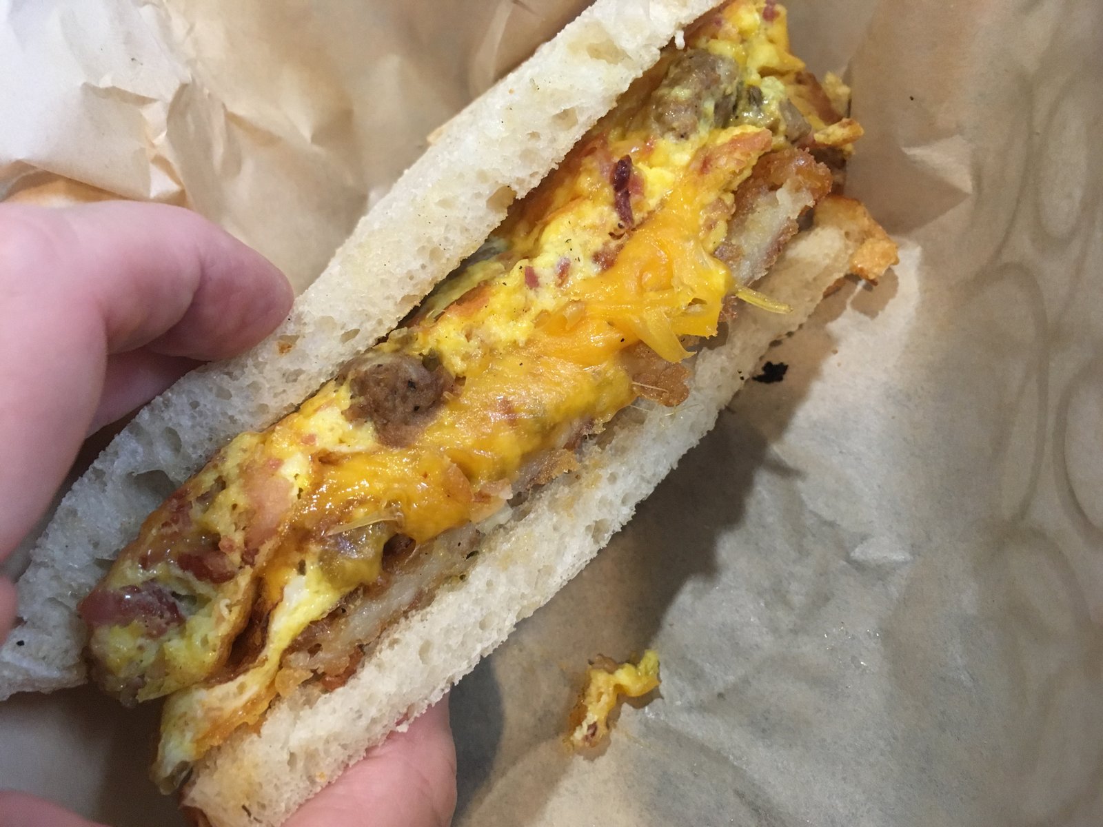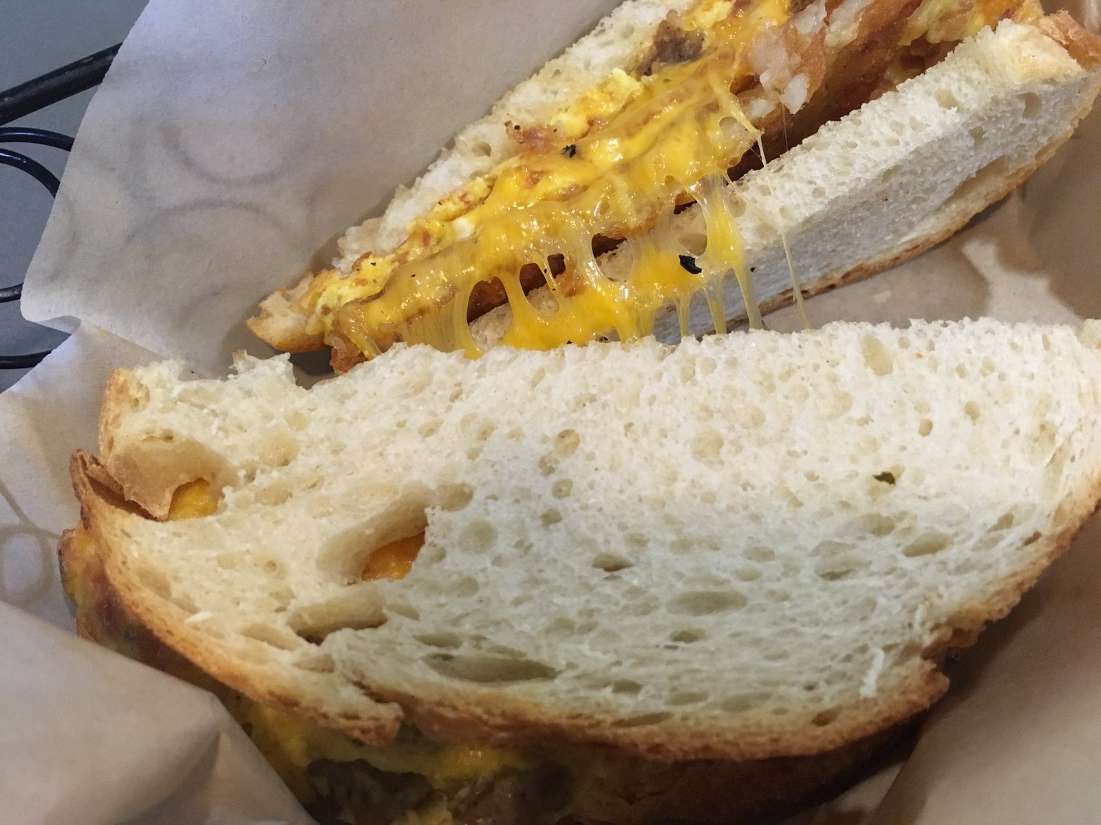 This is a "Super Sunrise" sandwich ($7.75) Scrambled eggs with sausage, bacon and cheese plus (making it a 'Super', opposed to the 'Sunrise Sandwich') a layer of hash browns. Choices of bread here are bagel, croissant, pita, sourdough or a multigrain thin. Each bite of this sandwich has exactly what I want in a breakfast. The fresh eggs, meaty bacon, (Italian, not breakfast) sausage, melted cheddar and crispy layer of hash browns are all perfectly cooked with various textures and fresh flavors.