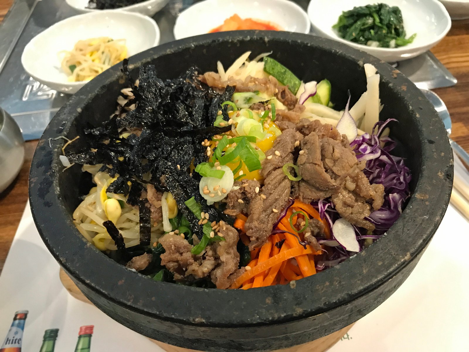 When the stone bowl arrives; She waits….munches on some panchan, has some of my naengmyun. After 5-6 minutes, She gives it a first stir, then She takes the juices from the now empty plates of baechu kimchi and kkakdugi and mixes it in with some chojang….and waits. We get another serving of panchan and eventually She starts eating, after a nice crust has formed. It's about patience and using the kimchi juice.