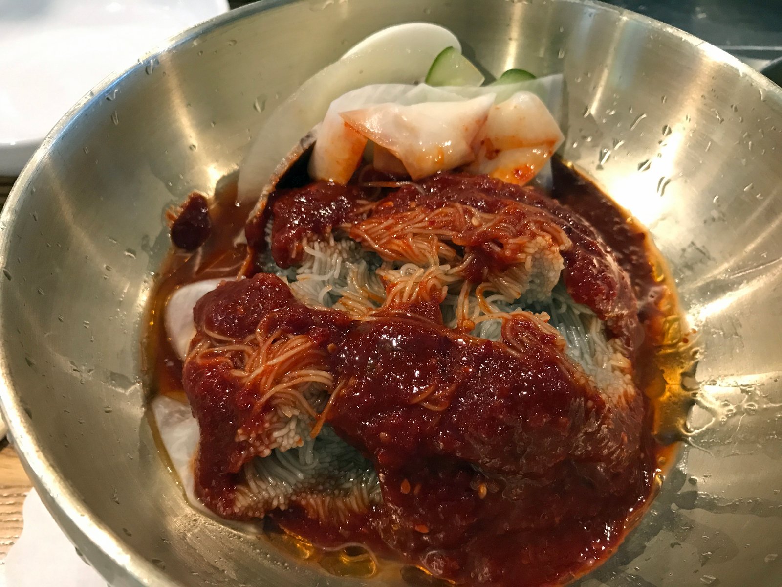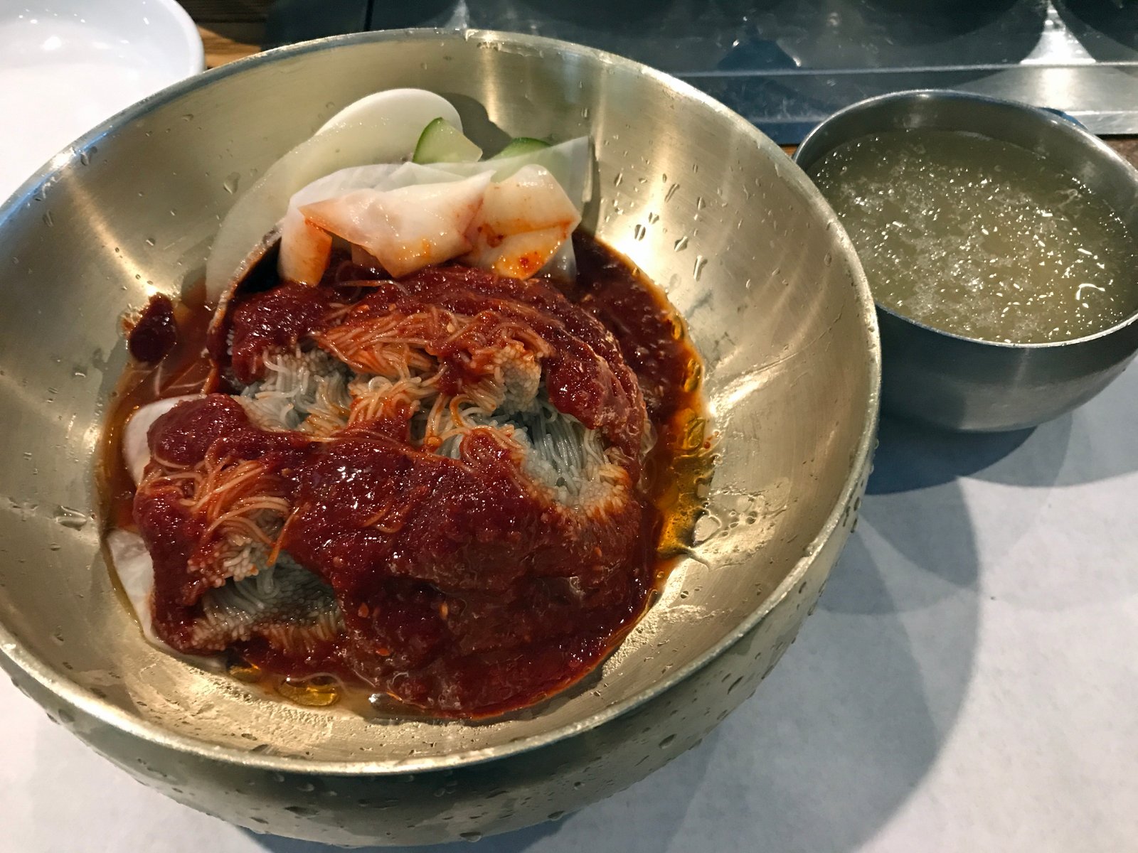 The noodles are stretchy, but not like rubberbands. The sauce has some nice heat for isn't overwhelming; just a touch of vinegar and perhaps even a squirt or two of cho-jang and I'm a happy camper. The portion size is rather large, but I can finish it all when I'm hungry. And in case you need to chill out, you're provided with a bowl of iced broth as well.