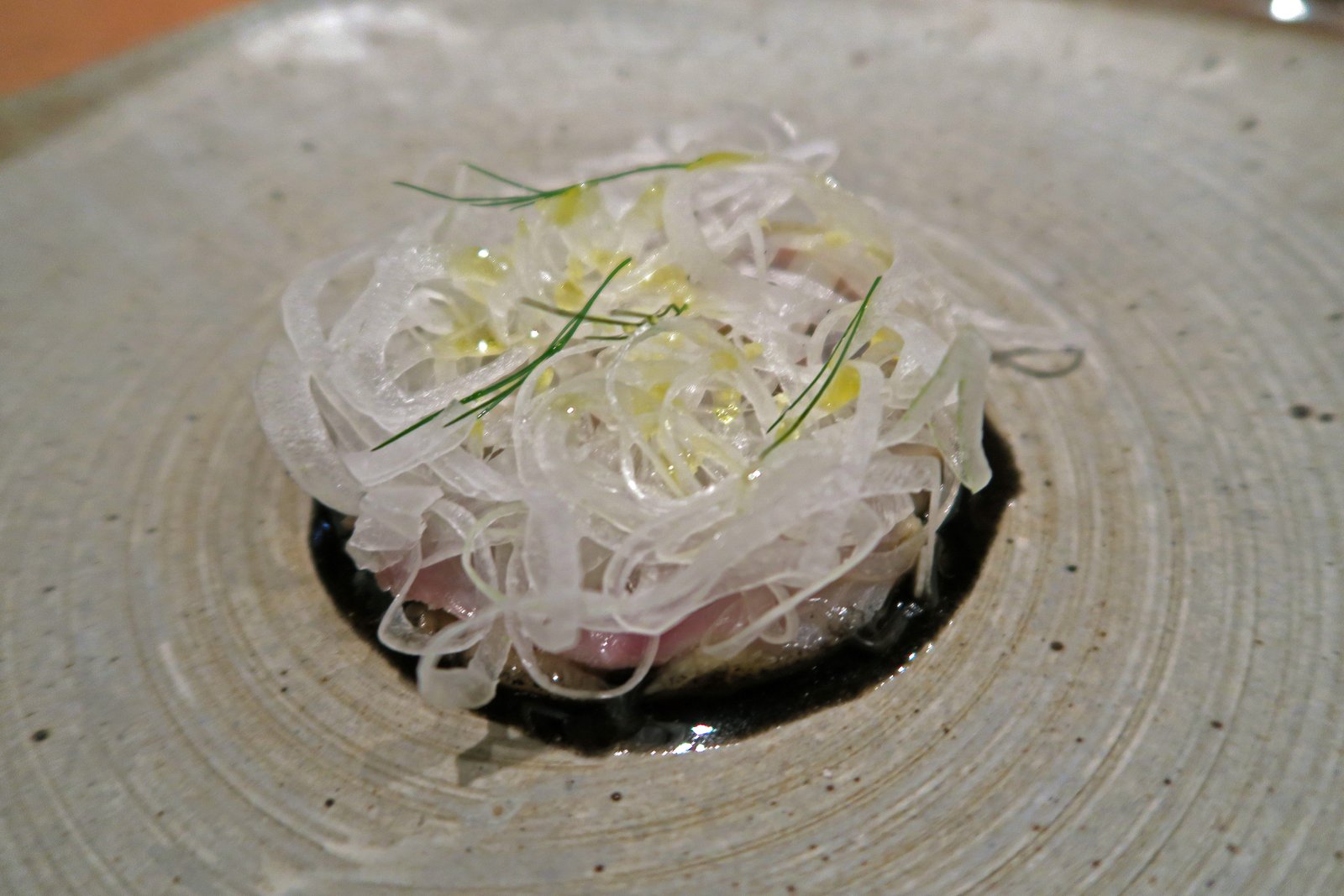 The next item might have been our favorite. Amazingly tender sea beam, topped with thinly sliced, slight pungent and sweet onion, on thin slices of daikon and smoky eggplant.