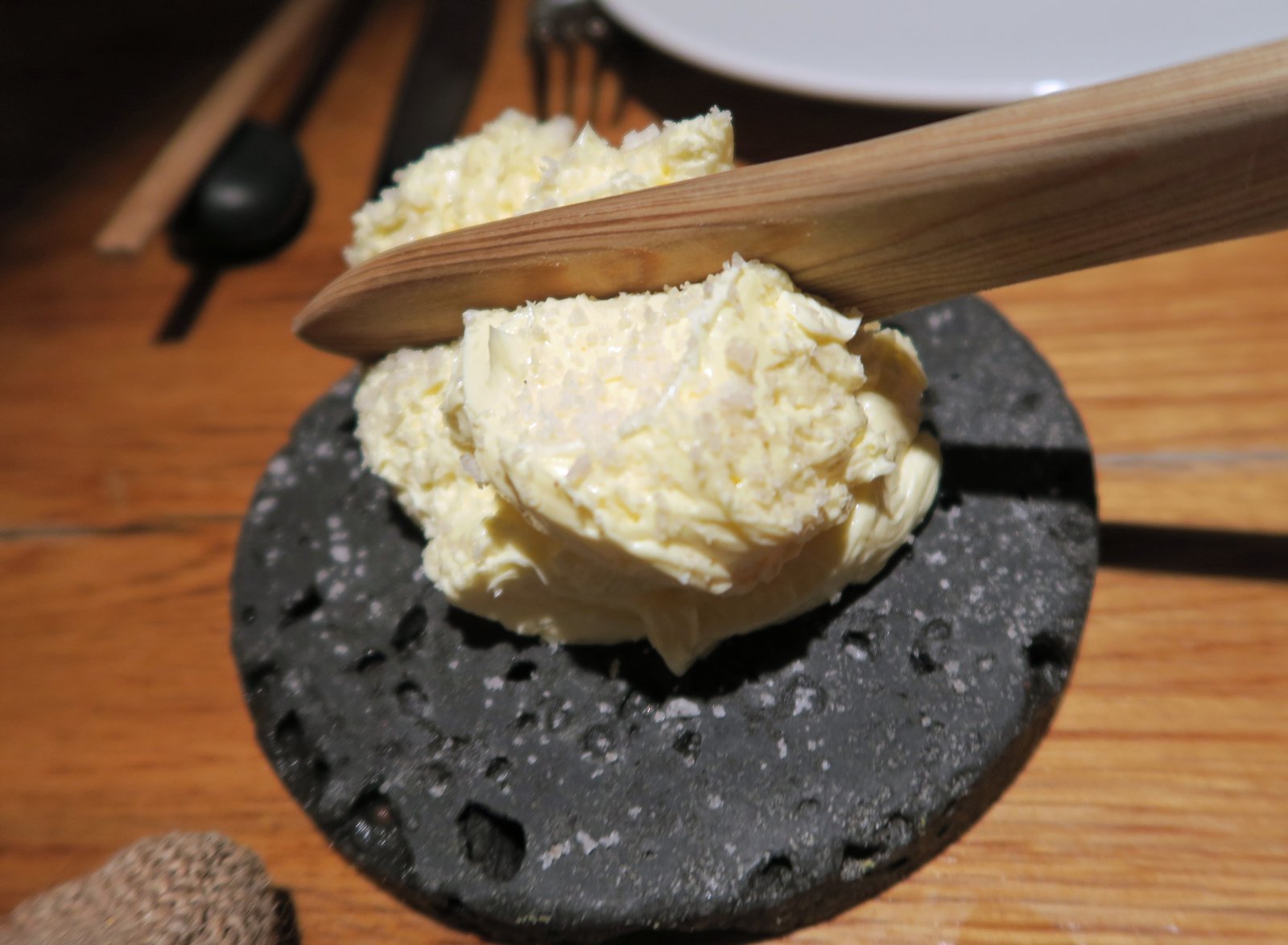 We finally got a table. Sitting we noticed folks were either getting sushi or the tasting menu. There's a bit of an Asian influences on some of the dishes here. We weren't super hungry and decided on ordering a la carte. As is the norm for us, we went with several starters and one main. Of course, things started with a fantastic moist rye bread and the amazing butter they have here in Iceland.