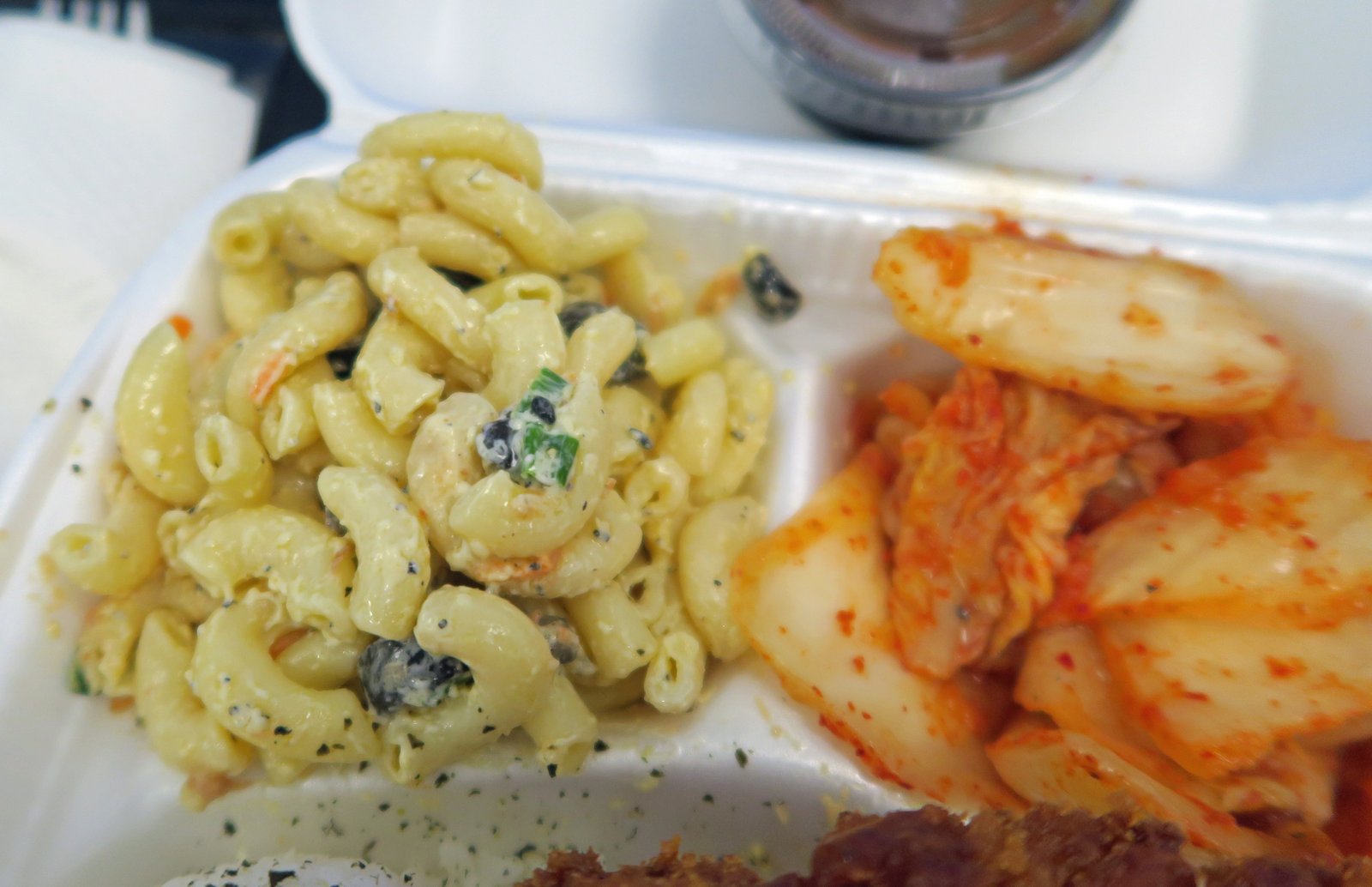 The kimchi was the typical "quick kimchi"; crisp, slightly spicy, but lacking in fermented flavor. I just wasn't a big fan of the macaroni salad; which was really dry; with some hard pieces, and quite bland overall. The rice? Well, that was well done, not too mushy, no hard bits. Only "one scoop" though. Which, these days is enough for me.