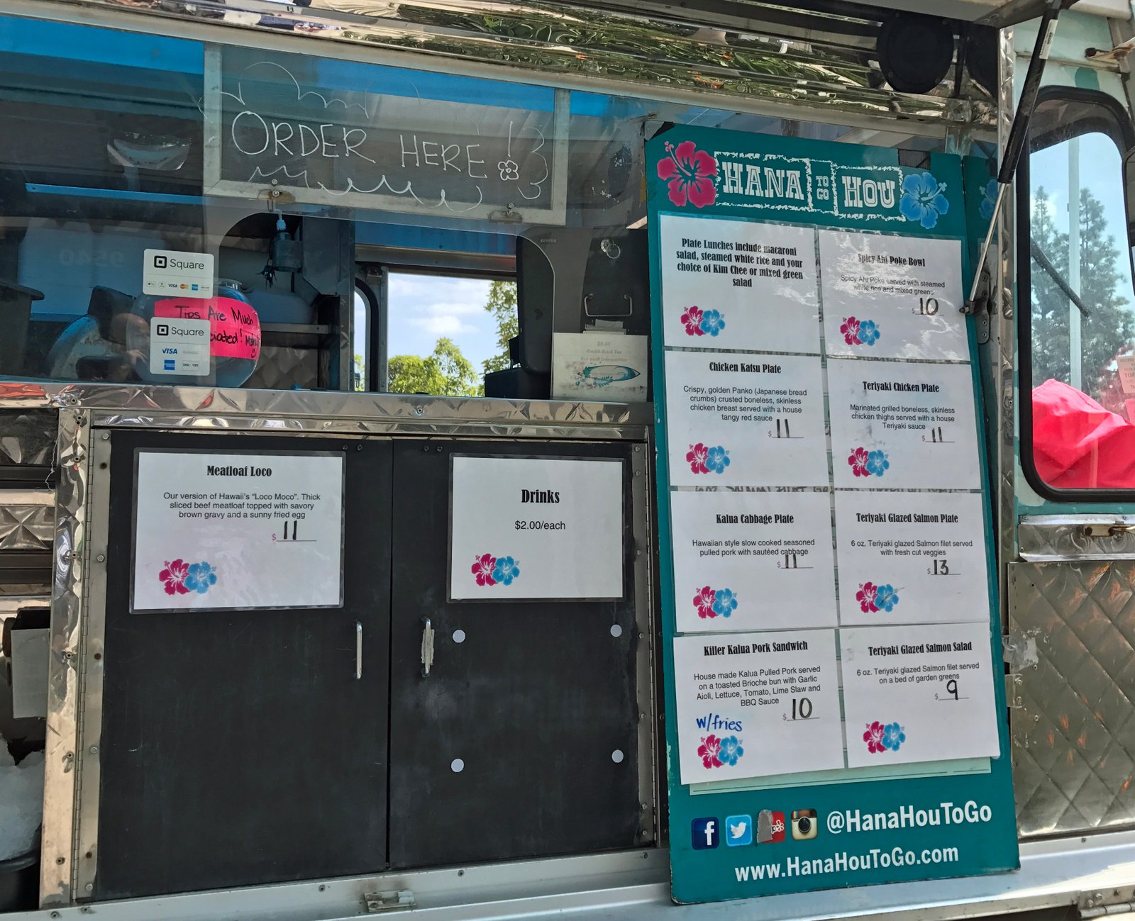 It named "Hana Hou to go". Hana Hou means "one more time" in Hawaiian. While I'm not fully sold on the Food Truck explosion; I grew up eating from lunchwagons, so local kine food from a truck makes sense to me. So I decided to give it a try. Though I gotta say' this ain't lunchwagon prices.