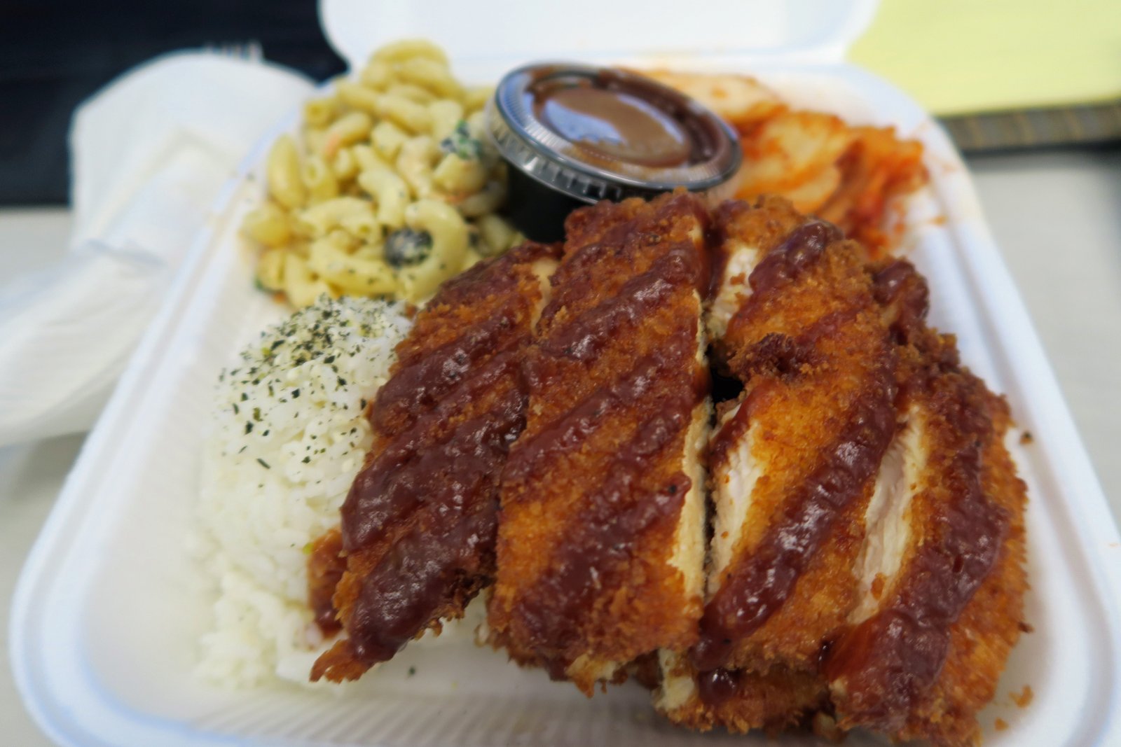 To be perfectly frank; the item I enjoyed the most was the katsu sauce; which was rather thick, but had a nice tanginess to it. It seemed between the typical Japanese style (like steak sauce) and the "local kine" (ketchup based). The chicken was fairly moist, even for white meat; though it was quite bland and cold and the breading was past the point of having very much crunch.