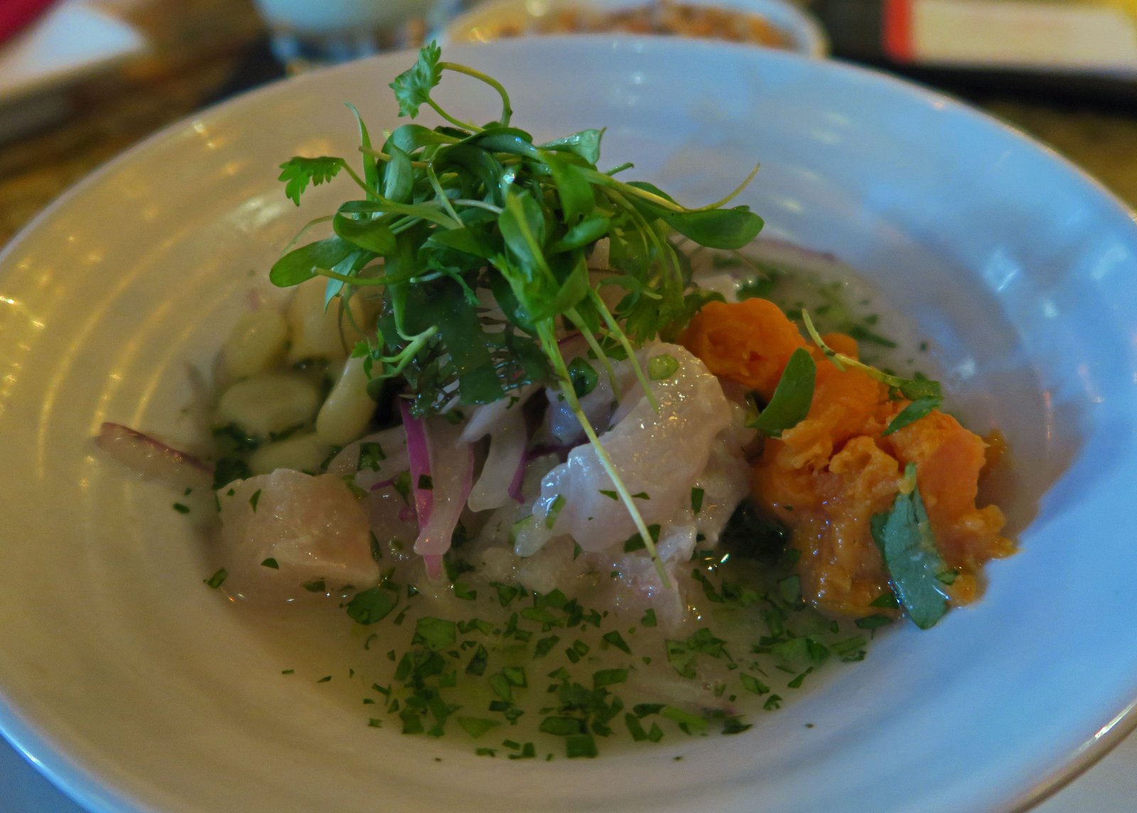 While the portion size was fairly small for twelve bucks; the whitefish was nicely "cooked" by the leche de tigre. Very tender in texture, good balance, leche de tigre not too sour, I enjoyed the chocolo (peruvian corn), but lamented the small portion of camote (sweet potato), which wasn't flavored correctly and was too mushy for my taste.