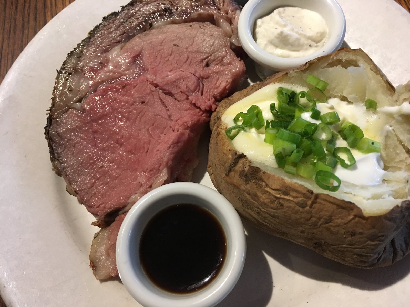 The 'petite cut' of prime rib (8 oz) ($19), perfectly cooked at medium rare and encrusted in a delightful herb mix. It was quite large enough for us to share, especially after that Appetizer Sampler. The baked potato was so large that we took half home to use for breakfast the next day.