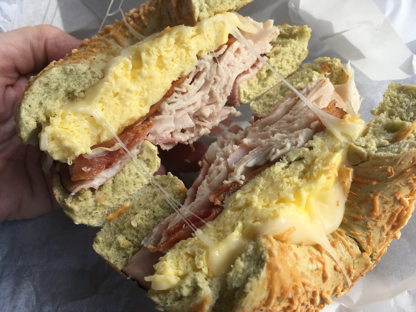 "The Works" ($5.75)- egg, cheese, bacon, turkey and ham on a spinach parmesan bagel. So good, so tasty, so much (quality) meat. You can see the bagel itself has a green tinge from the spinach. By itself, this bagel is tasty.