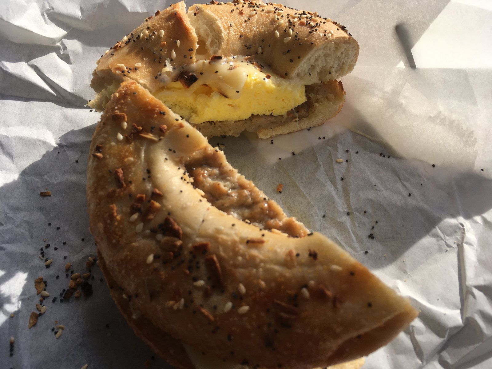 Egg, cheese, sausage on an everything bagel ($4.75) was great- a good, thick, quality sausage, Swiss cheese, fluffy egg and the fresh, toasty bagel. It was perfect and as I remembered it.