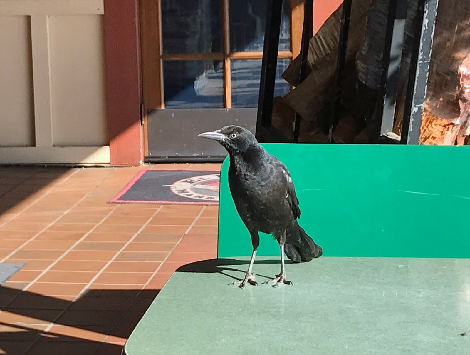 The Missus and I split a bottle of sparkling water and watched this really aggressive crow beg for demand handouts.