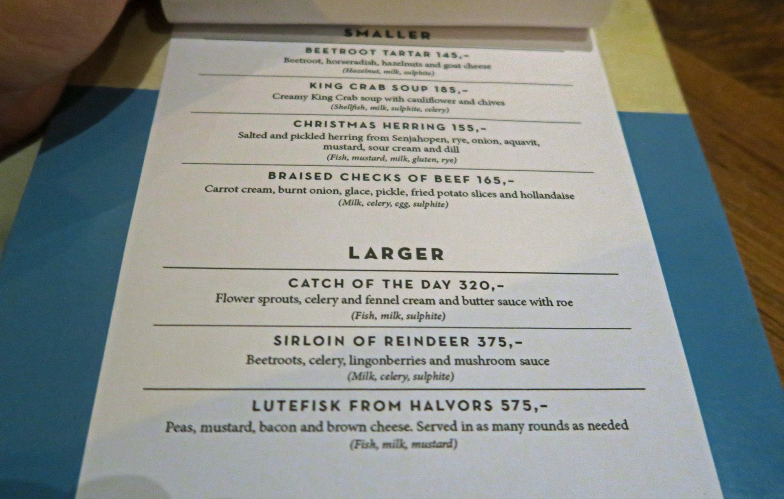 I ordered the Lutefisk (575 NOK – $70/US). Yep, about seventy bucks US…..yikes!