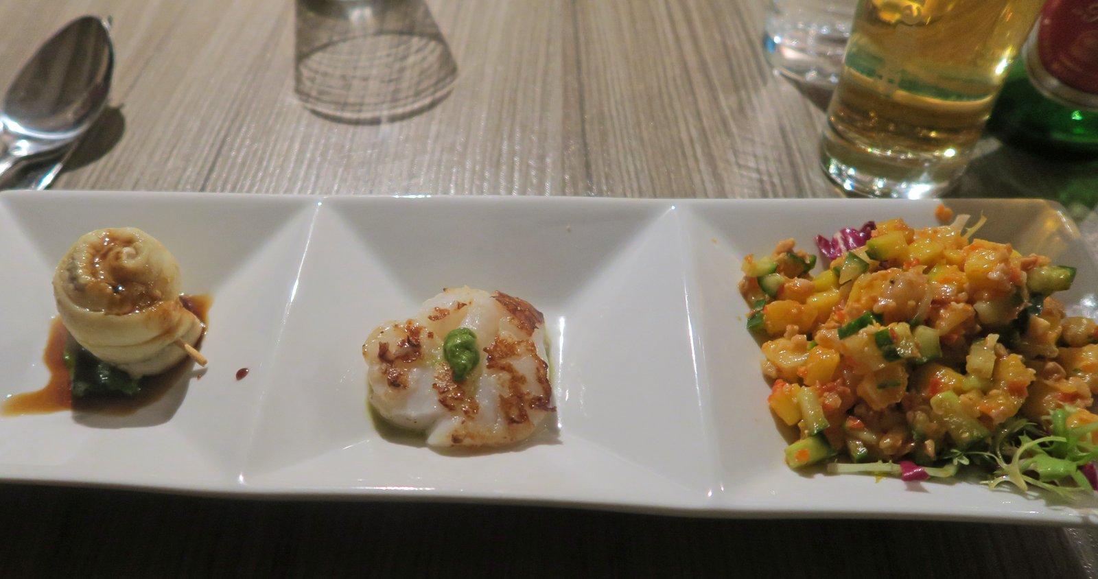 The meal started off with three appetizers. This might have been our favorite part of the meal, especially the scallops which were perfectly seared, still tender and moist inside. And the whitefish which was almost buttery.