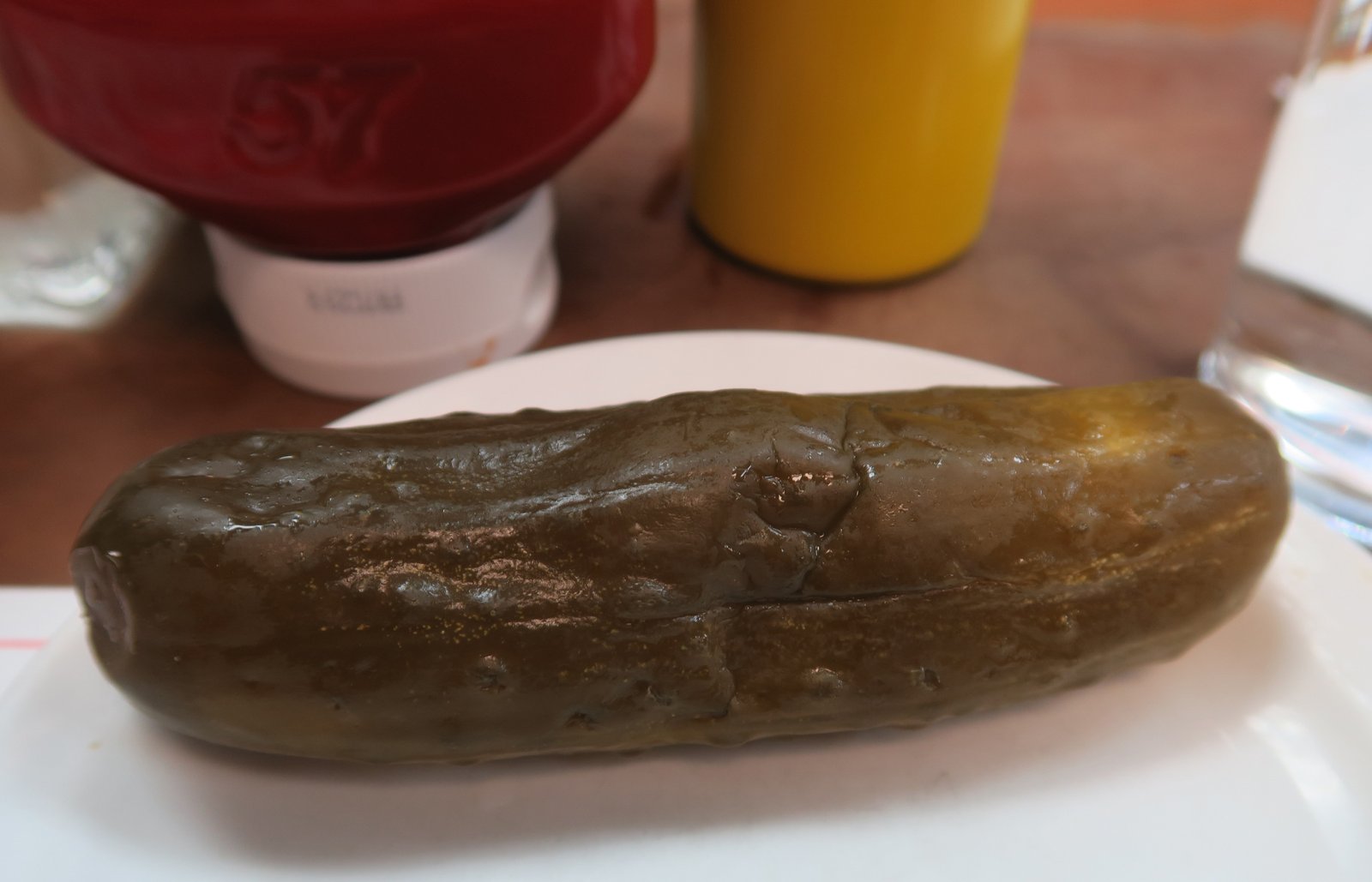 The young man pointed out that the "classic" Schwartz's combo was a Smoked Meat Medium Fat, Fries, Dill Pickle, and a Cherry Soda……we got fifty percent of that, the dill pickled, crisp, nicely balanced in flavor and the Smoked Meat Sandwich Medium Fat (9.75 CAD – about $7.40/US !!!). We watched with anxious anticipation as the meat for our sandwich was hand cut.