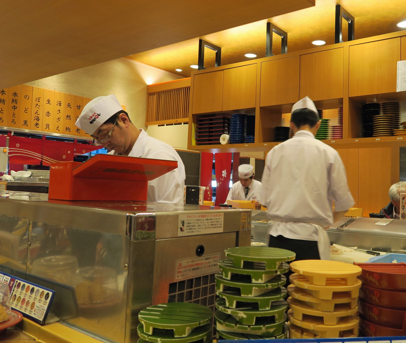 We were starting to get hungry. Not sure where to eat, we decided to walk back to Omi-cho market. There was a Kaiten-zushi shop in the market that always seemed to have a line. I'm not big on conveyor belt sushi here in the states. It's usually of very low quality; but heck, if all these Japanese were lining for it…..