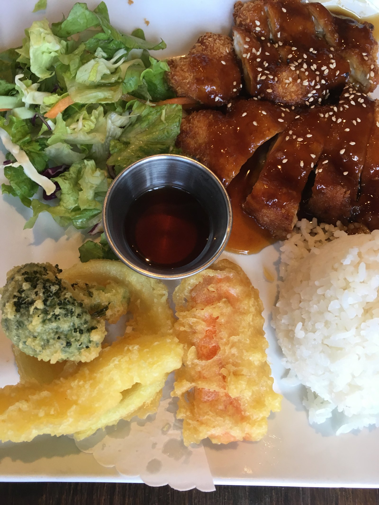 The chicken katsu and tempura plate ($8.45) also comes with a bowl of miso soup and is properly fried: crunchy and not greasy. The refreshing salad arrives 'naked' and there is a container of salad dressing on the condiment tray on the table.