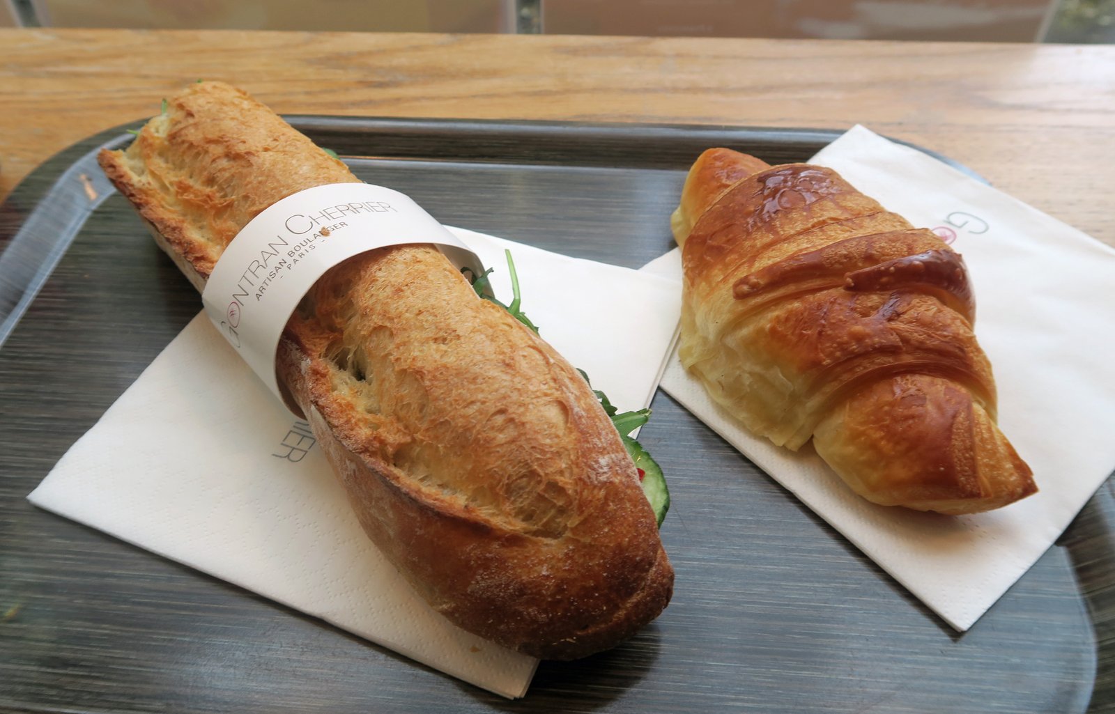 It was easy to pick out what we wanted….the Missus had decided to try at least half a dozen croissants in Paris, so this would be the first. We also got a sandwich; a veggie version. The miso bread would have to wait for another day.