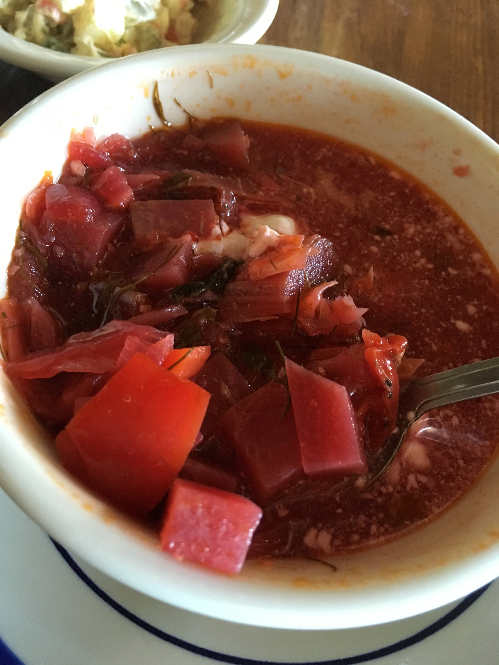The Ukrainian borscht is has the same ingredients plus beef and is also wonderful. The third soup, a sour cabbage vegetable based choice has smoked sausage and beef in it. No photo, but I heard it was excellent.