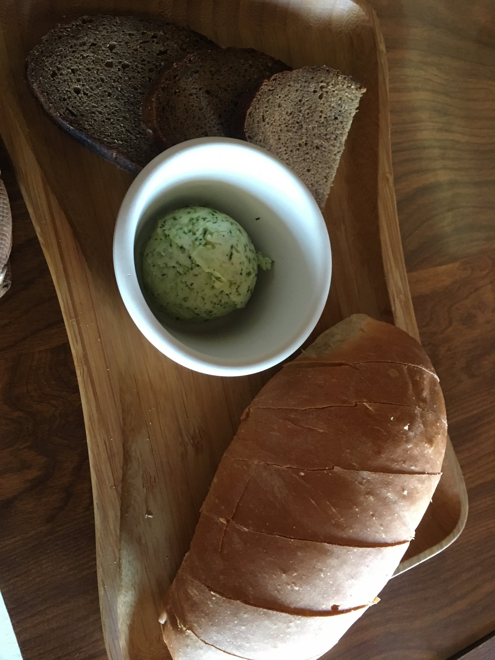 Soft crusted fresh bread, heavy thin slices of rye and garlic butter is brought out.