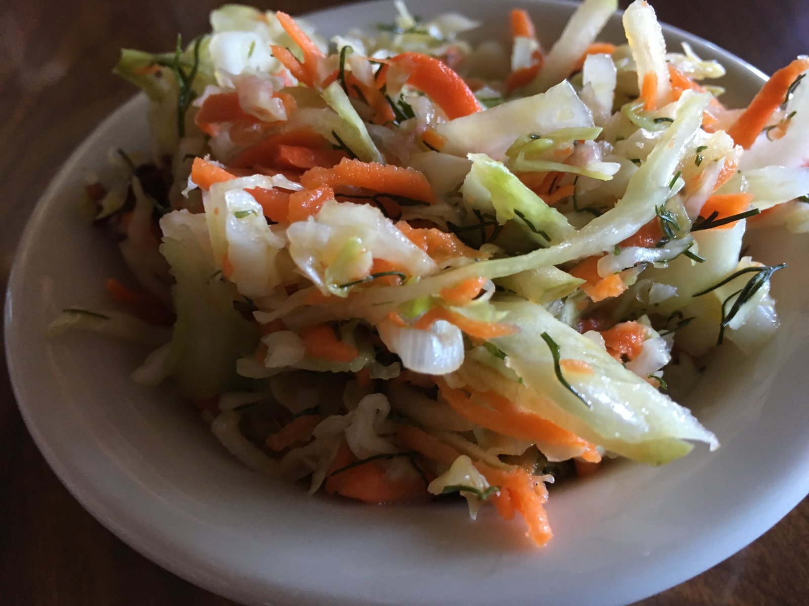 There are five salads to choose from and the Vesna is the 'plainest'. Cabbage, carrots, onions, cranberries and apples with fresh dill make this a flavorful simple salad.
