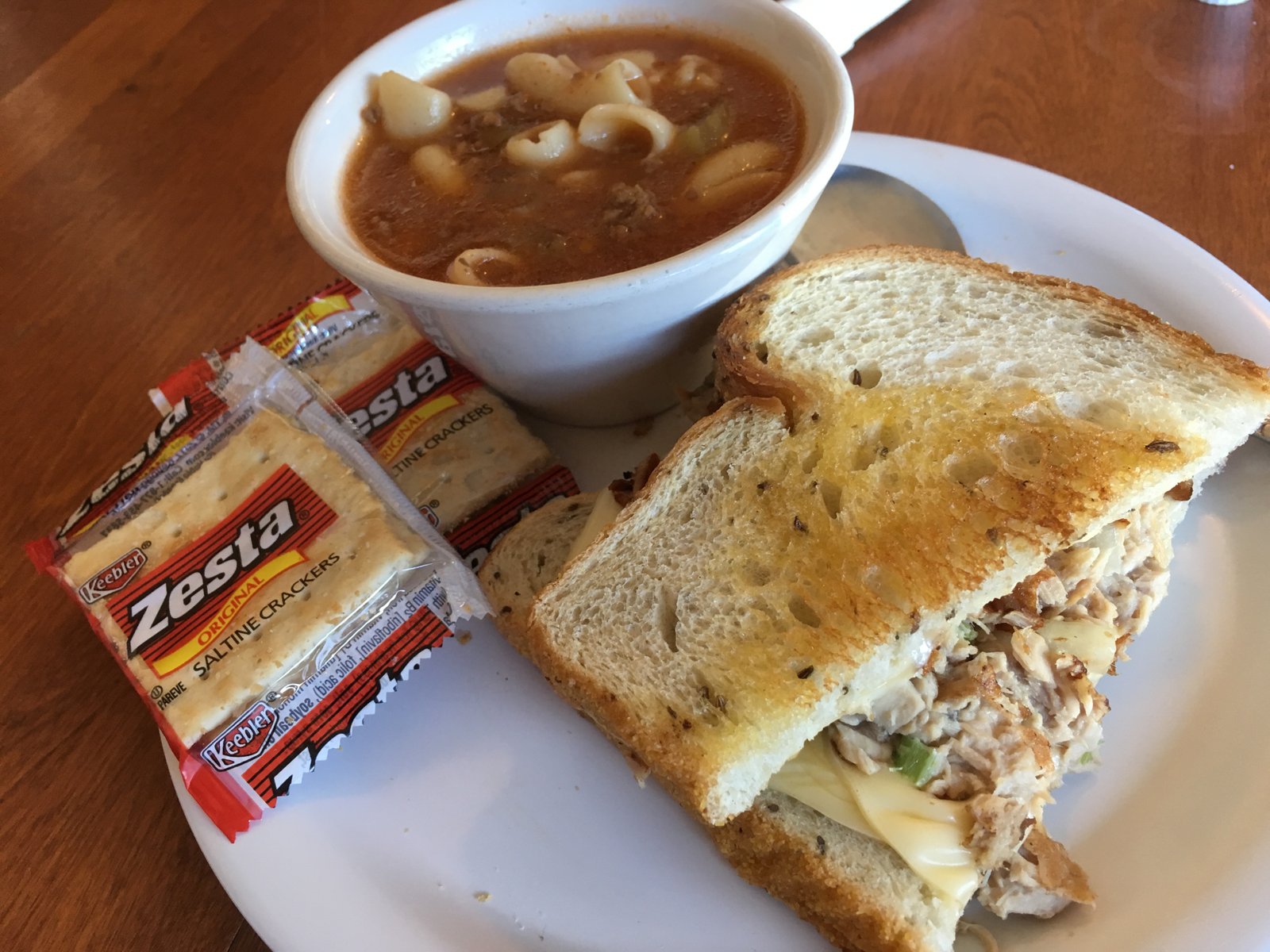 The soup of the day was Vegetable Beef and it was so good! Hamburger, tomato, onion, celery, green pepper and those macaroni noodles. It tasted so much better than when I toss similar leftovers in a pot.