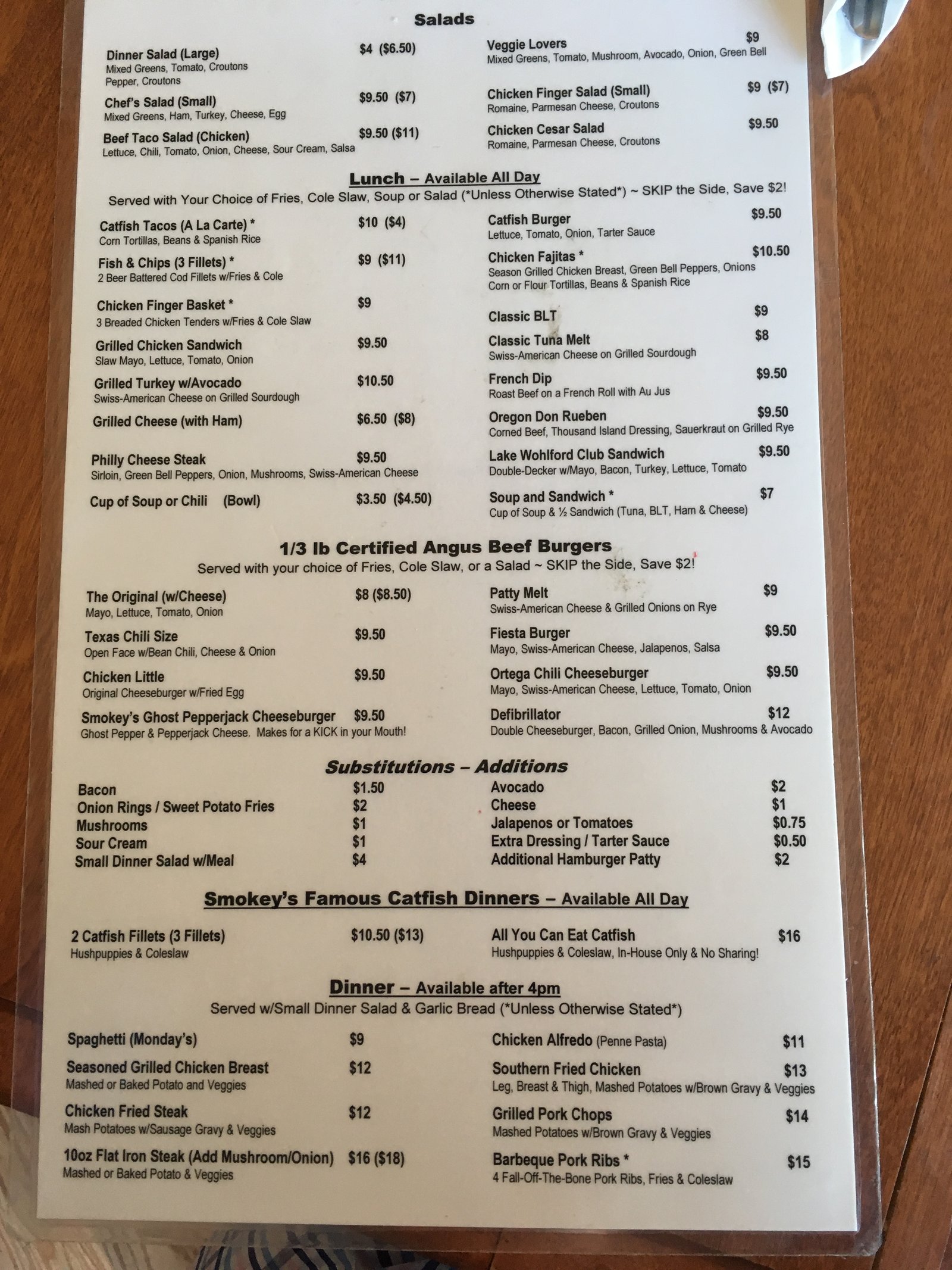 Stepping inside, the small store to the left, bar and tables in front of you and general atmosphere, with friendly waitresses, is comforting and familiar. The menu (at the bottom of this post) is pretty much the same (there's still catfish as a breakfast meat choice). We were here in the afternoon, so chose from the lunch menu.