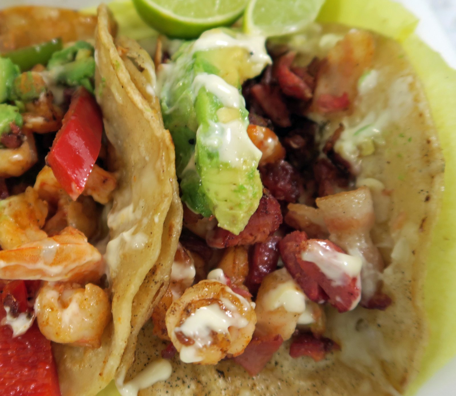 "marlyn". This was quite good as the crunchy bacon, complemented the shrimp and smoked tuna, which wasn't overly salty. The avocado and squeeze of lime, along with the standard seafood salsa just worked together in harmony. The tortilla; though quite standard held together well with the light coating of melted cheese protecting the integrity of the taco.
