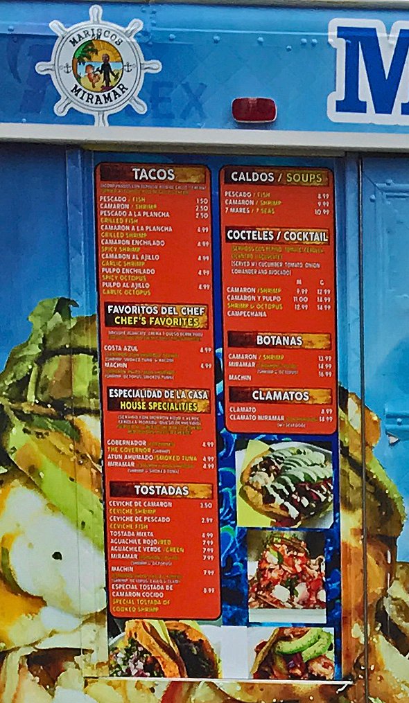 The menu is nicely varied; from the usual Mariscos Truck suspects; the Gobernador, Fish Tacos, Camarones a la Plancha, Tostadas, Cocteles, and Botanas.