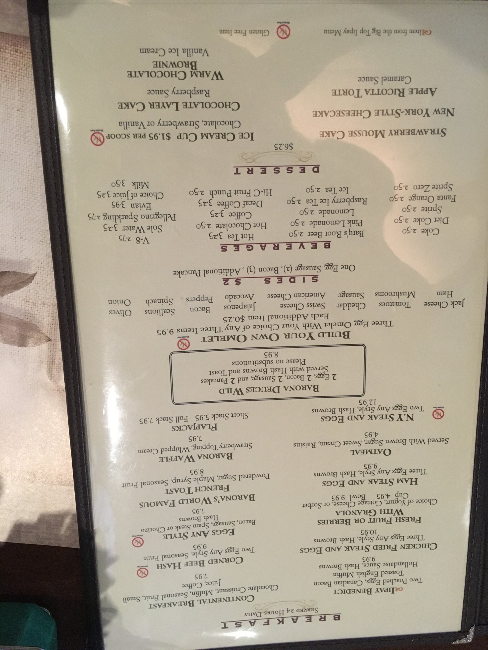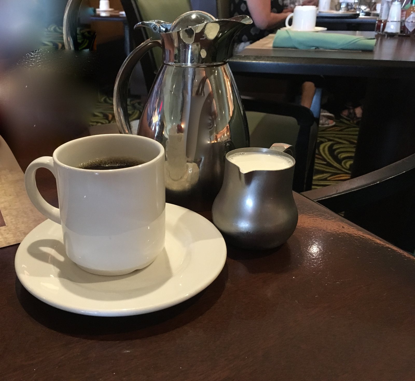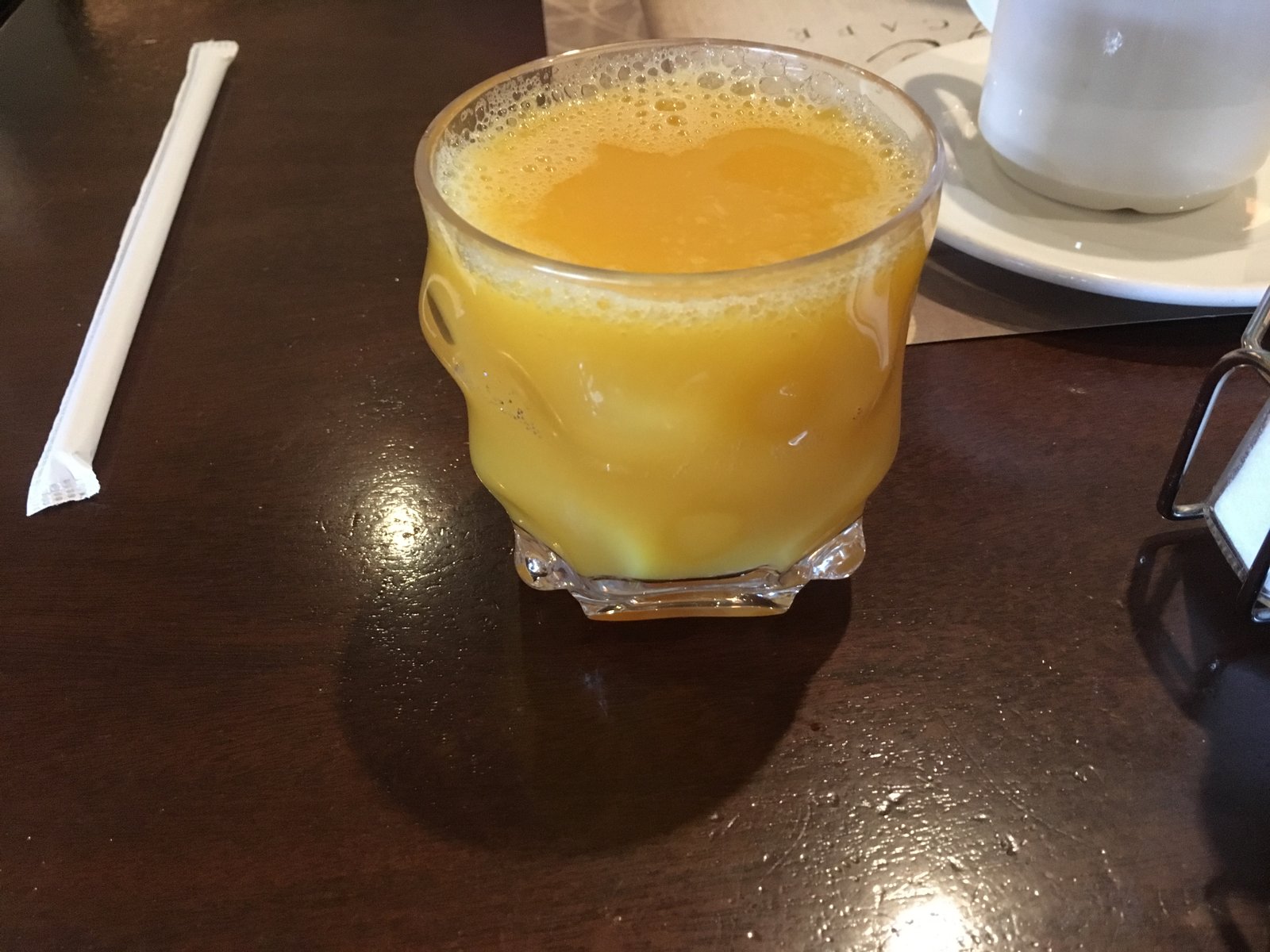 Coffee and orange juice along with fresh fruit and a chocolate croissant and banana nut muffin, is the Continental Breakfast here ($7.95)